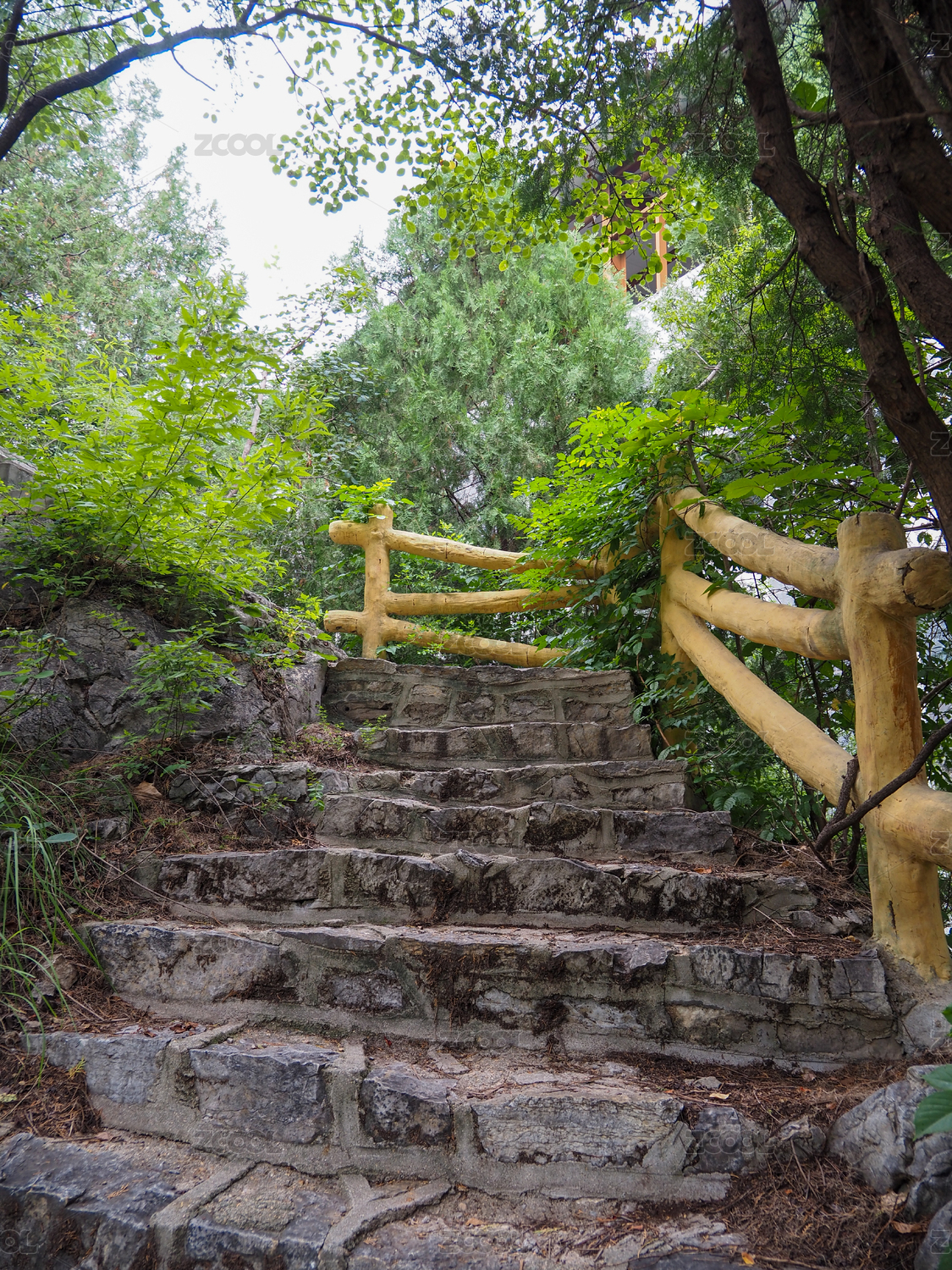 中国山西省太原市晋祠假山绿荫小径木门楼园林景色