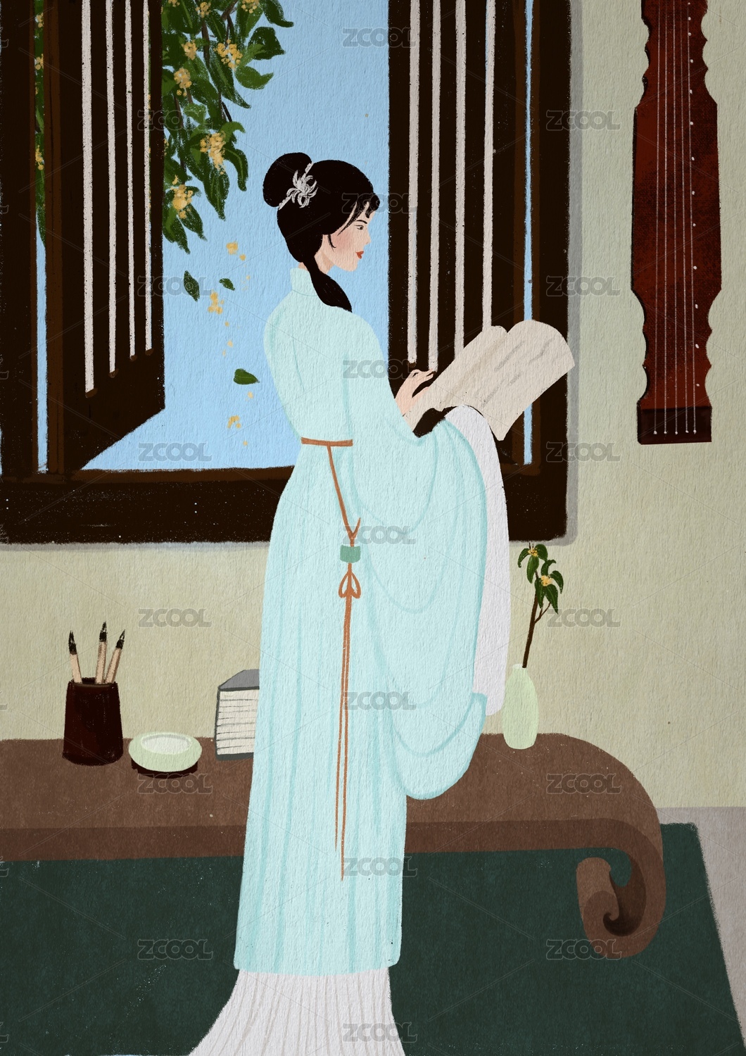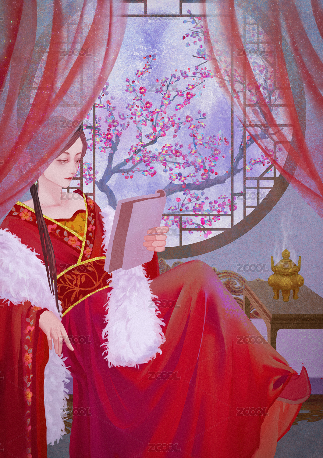 梅花窗帘女人坐在窗户床上桌子香炉读书学习
