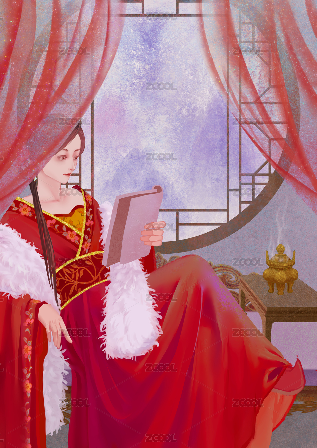 窗帘红衣女人坐在窗户床上桌子香炉读书学习