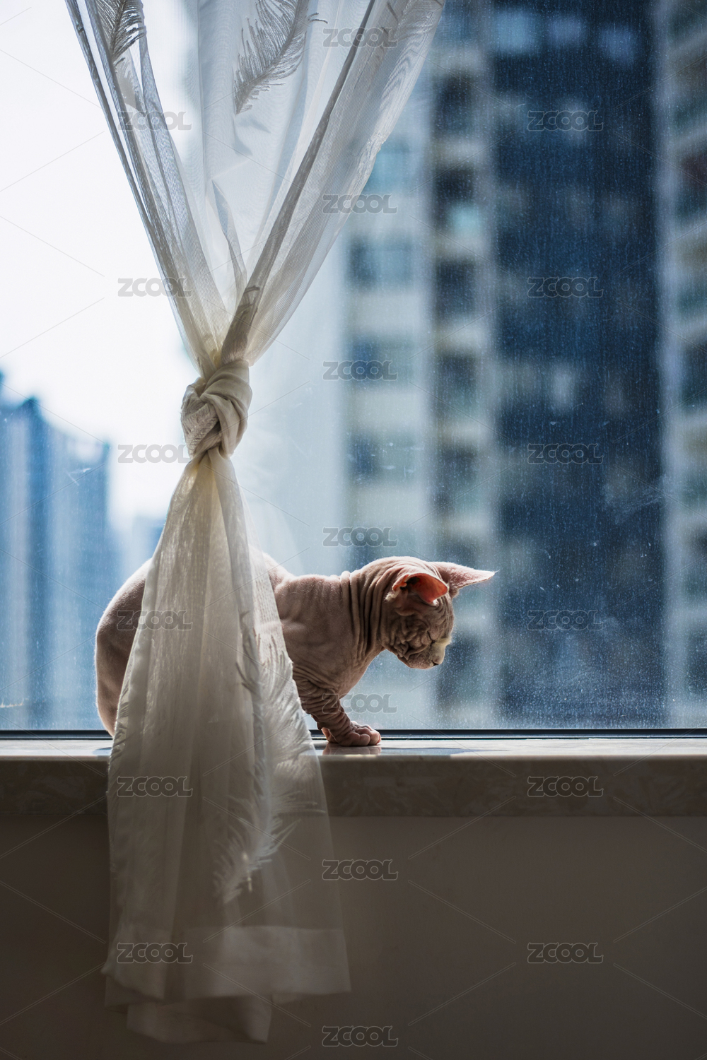 斯芬克斯无毛猫在阳台低头休息