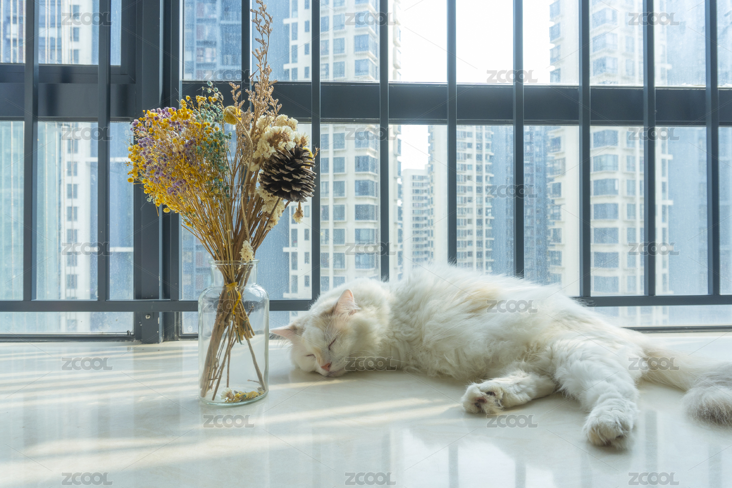 强烈的阳光下长毛布偶猫在阳台睡觉