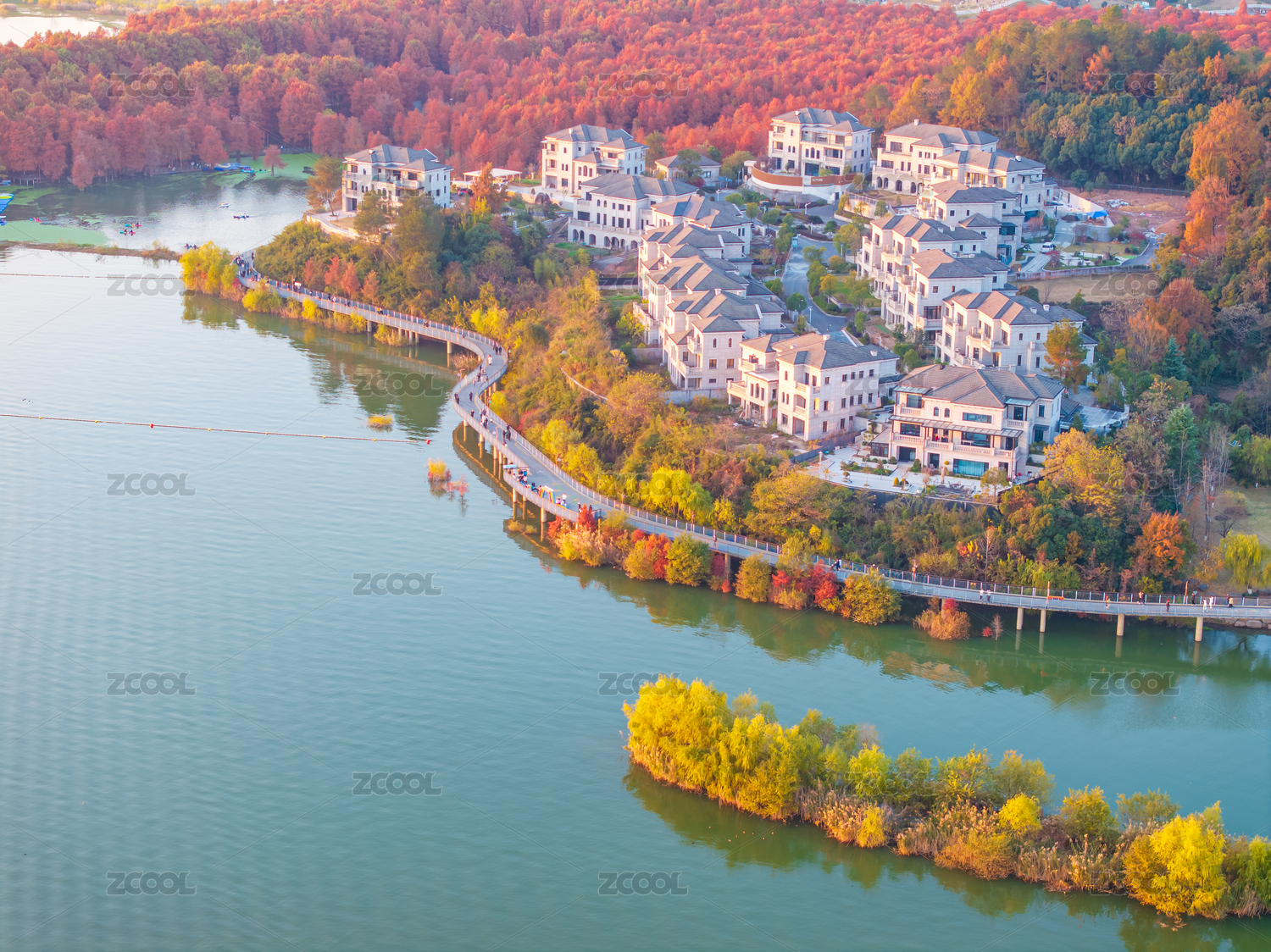浙江省杭州市湘湖景区秋色晨曦航拍