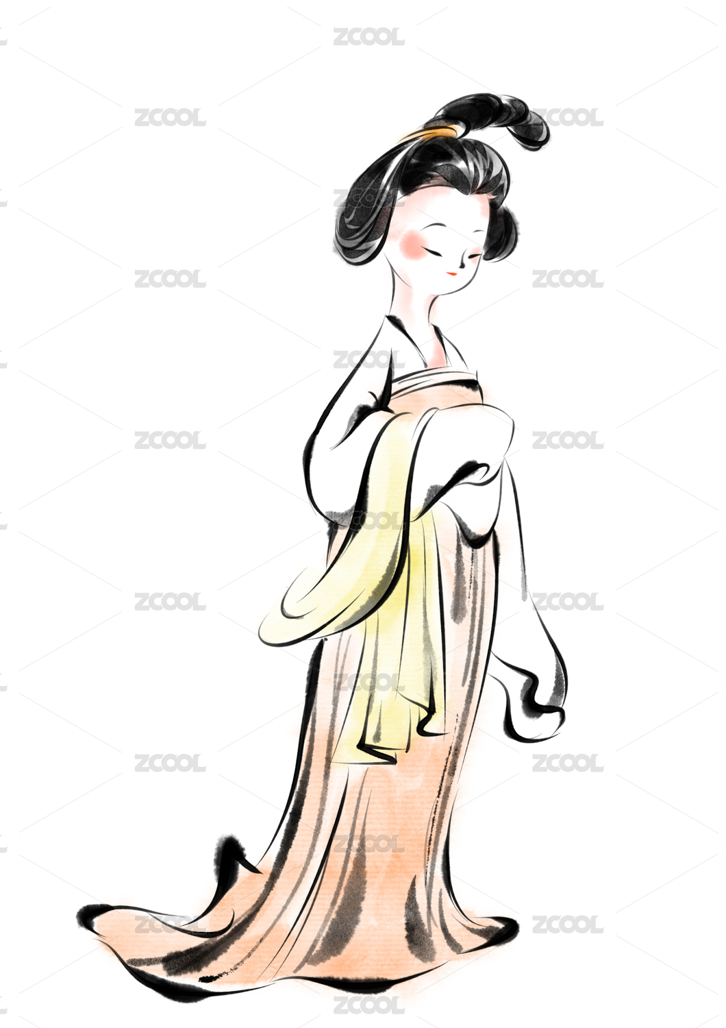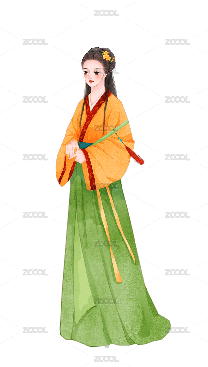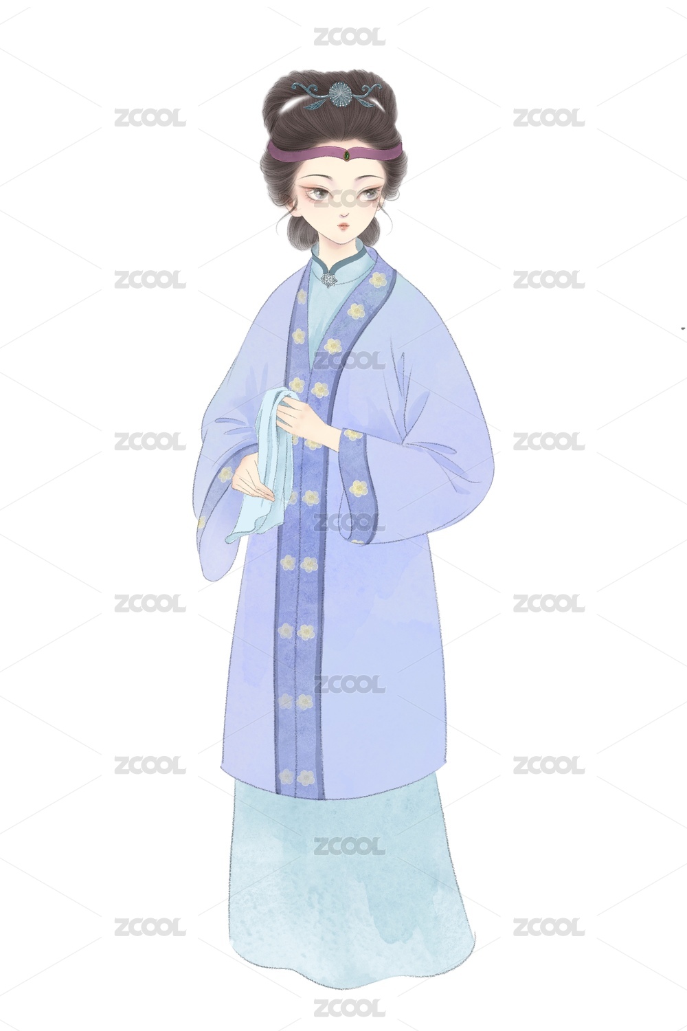 蓝色襦裙的古装少女衣服随风飘扬 水彩手绘