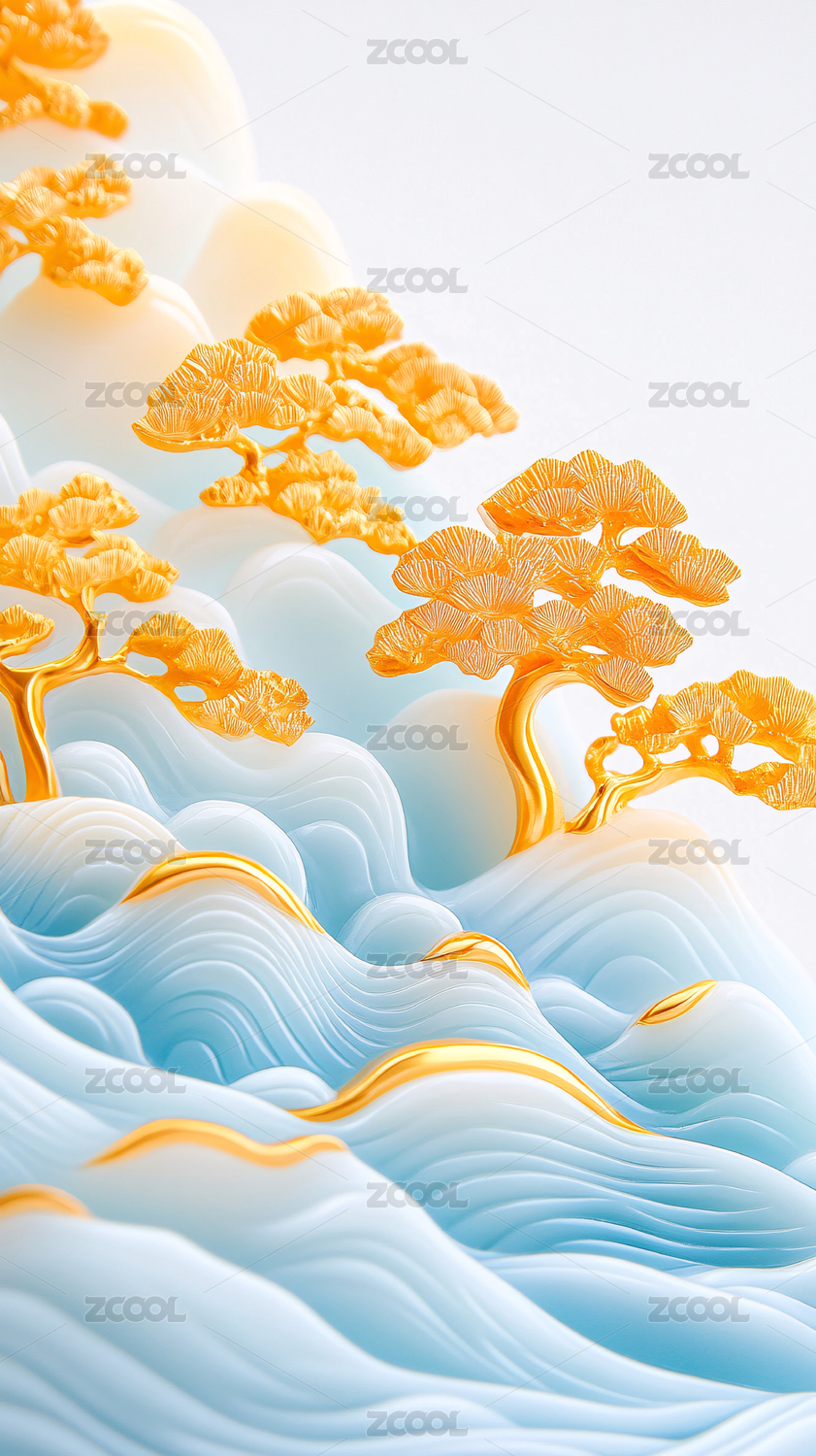 金色树木水墨青绿山水画