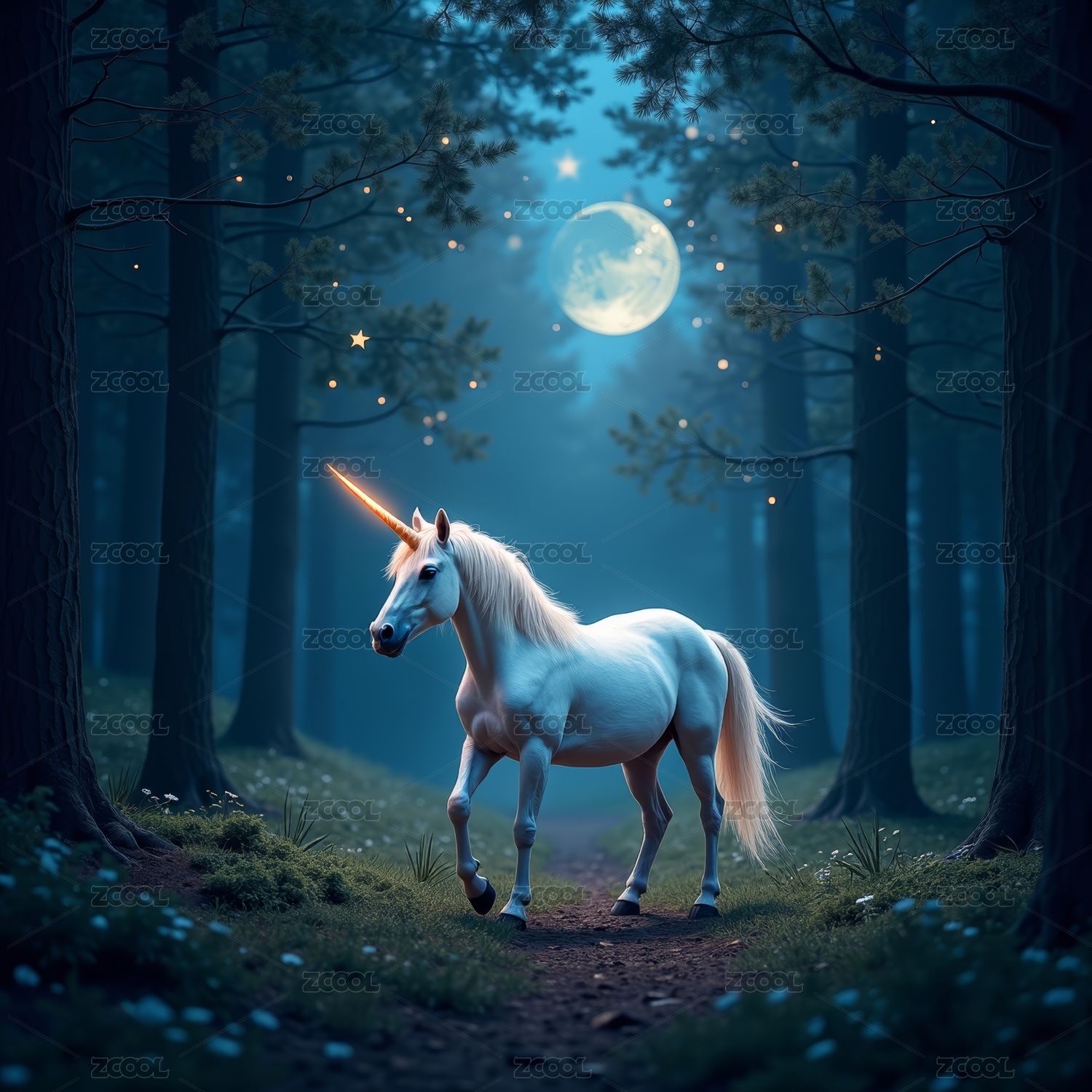 艺术, 绘画, 夜晚,独角兽, 森林, 神秘, 梦幻, 奇幻, 魔法, 宁静