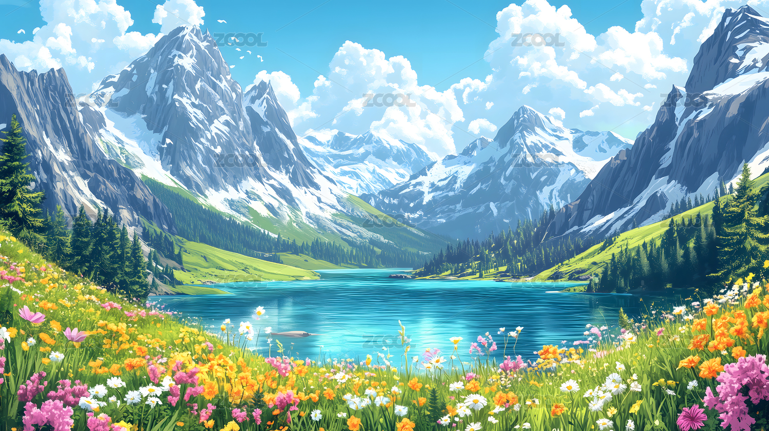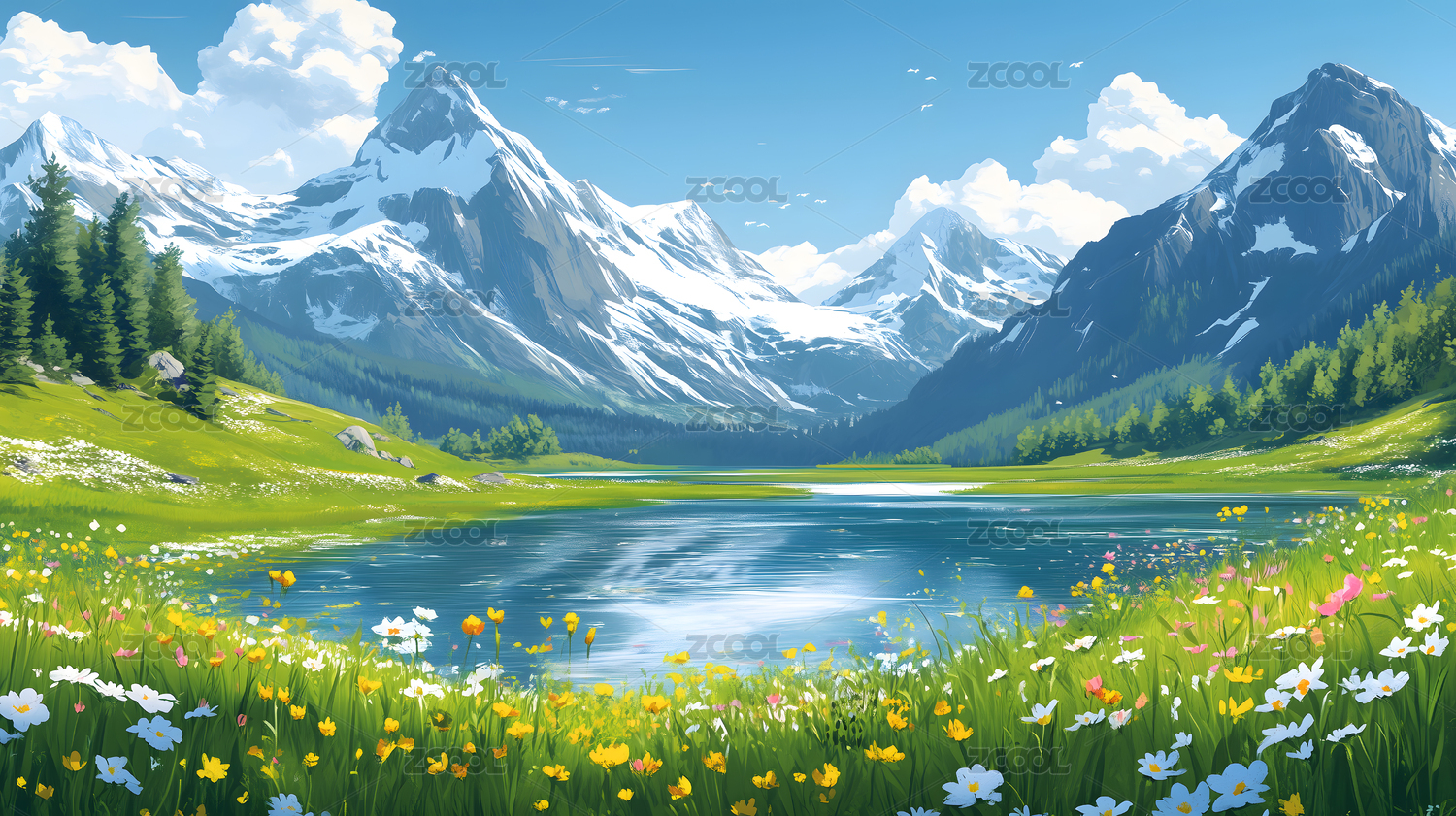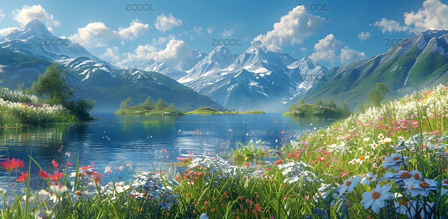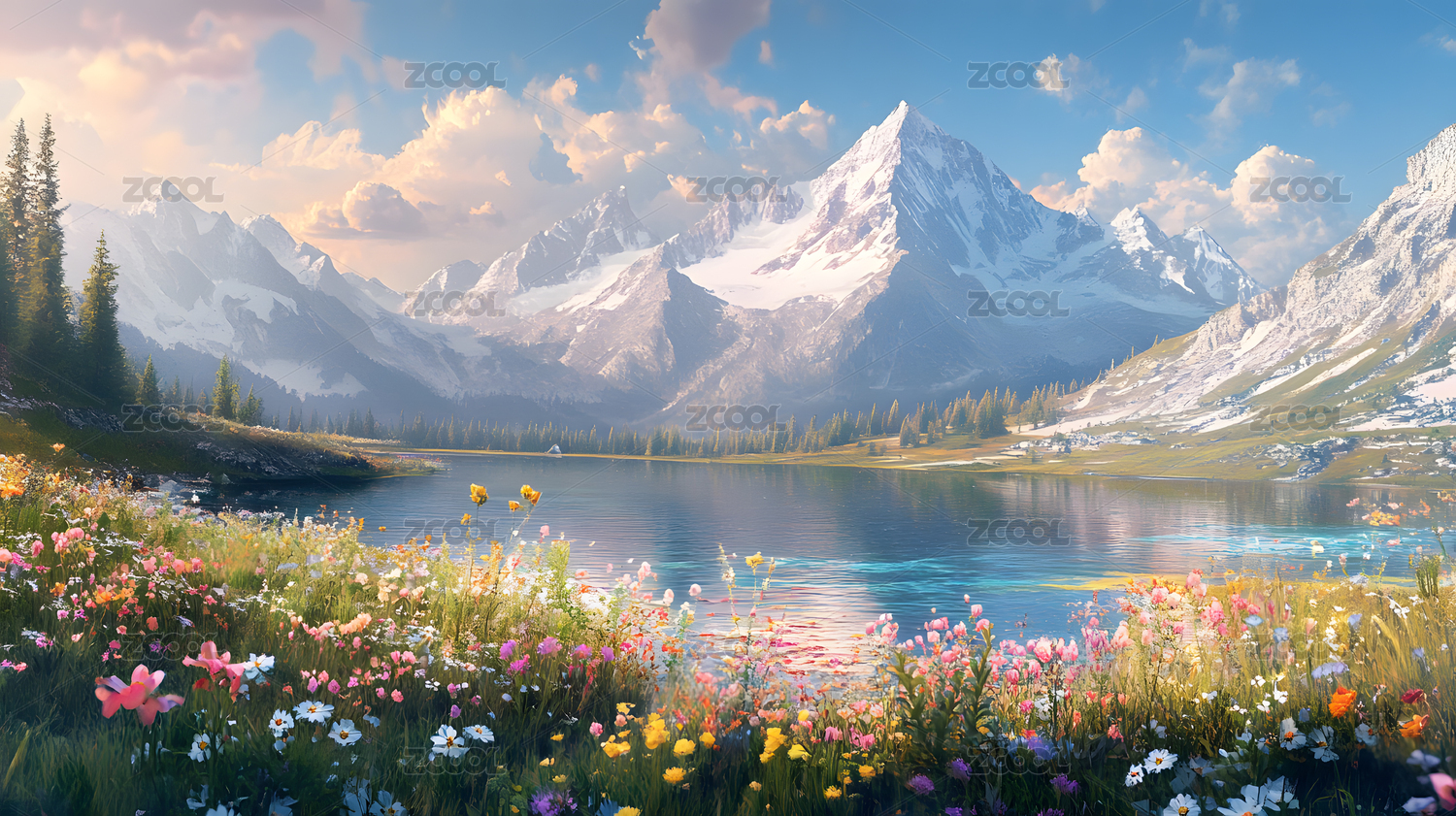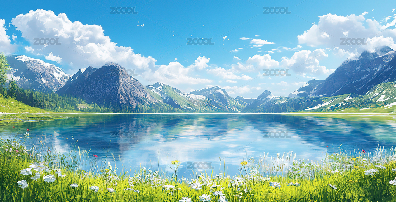 宁静,祥和, 美丽, 自然, 艺术, 绿色,向日葵, 山脉, 湖泊, 白云