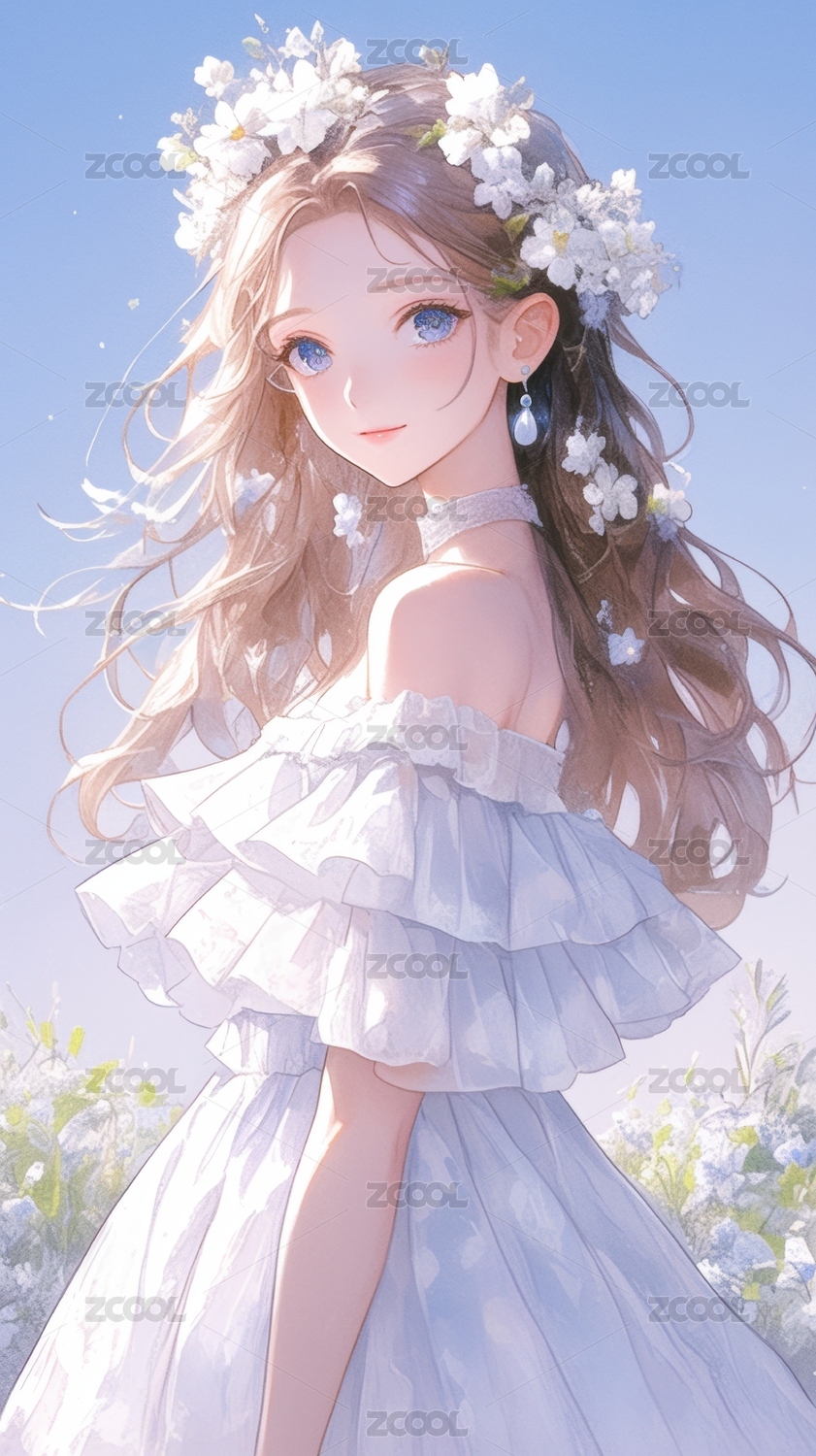 女生,长卷发,月牙,金发,浪漫,甜美,可爱,手绘,彩铅,白底