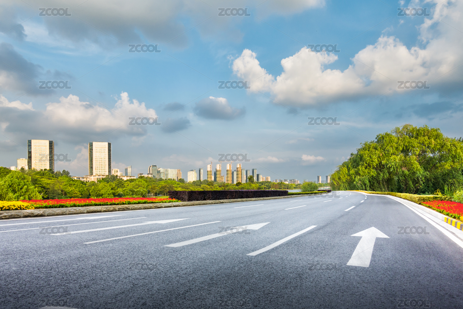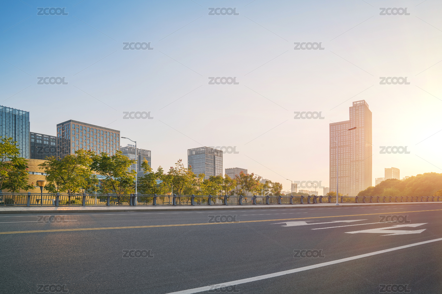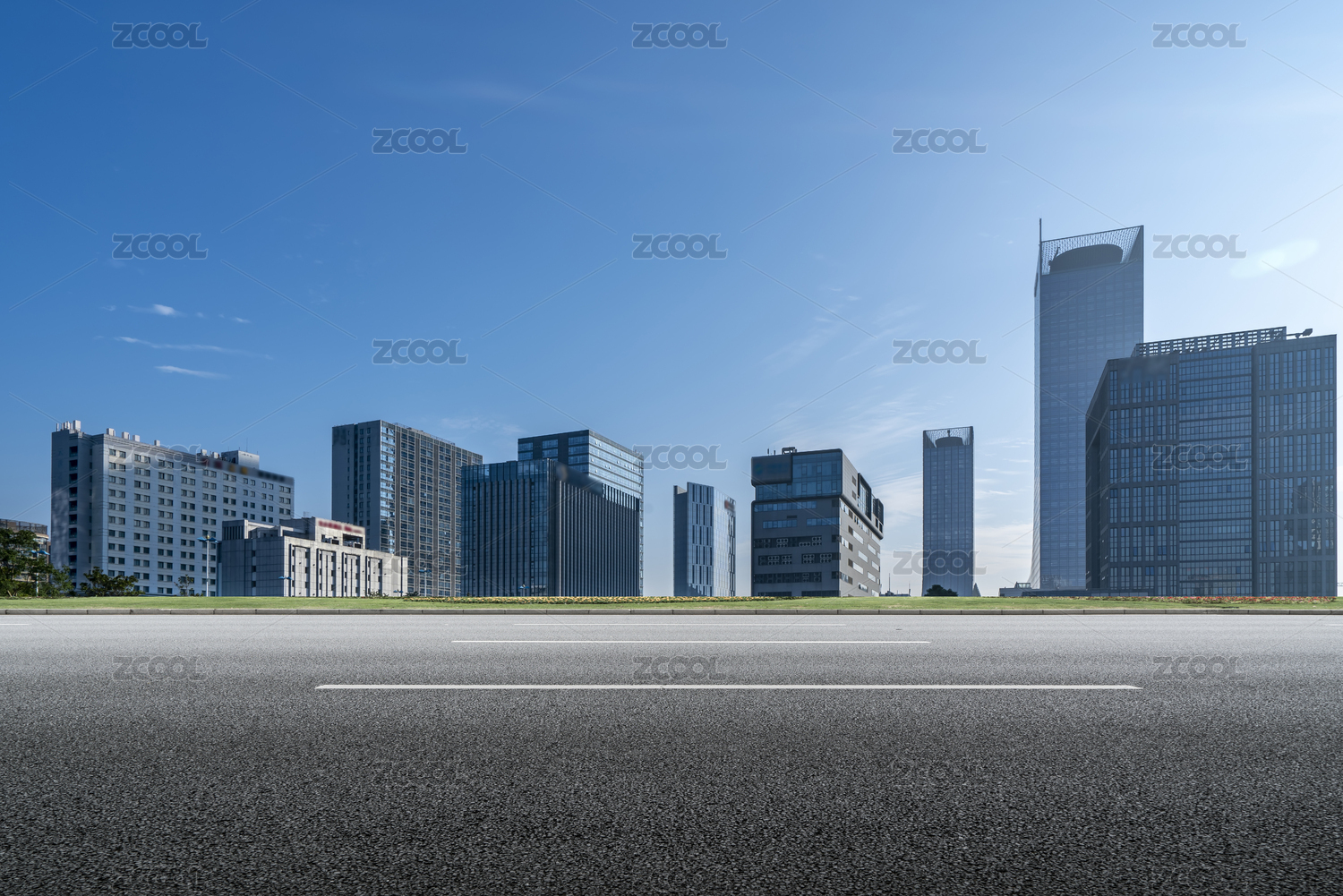 中国杭州空旷的柏油路与现代城市建筑天际线