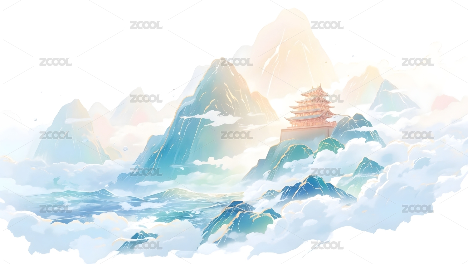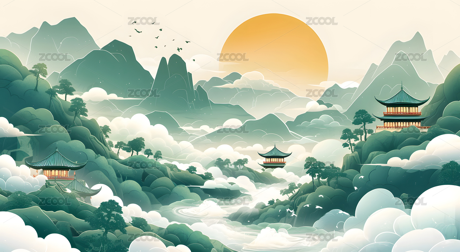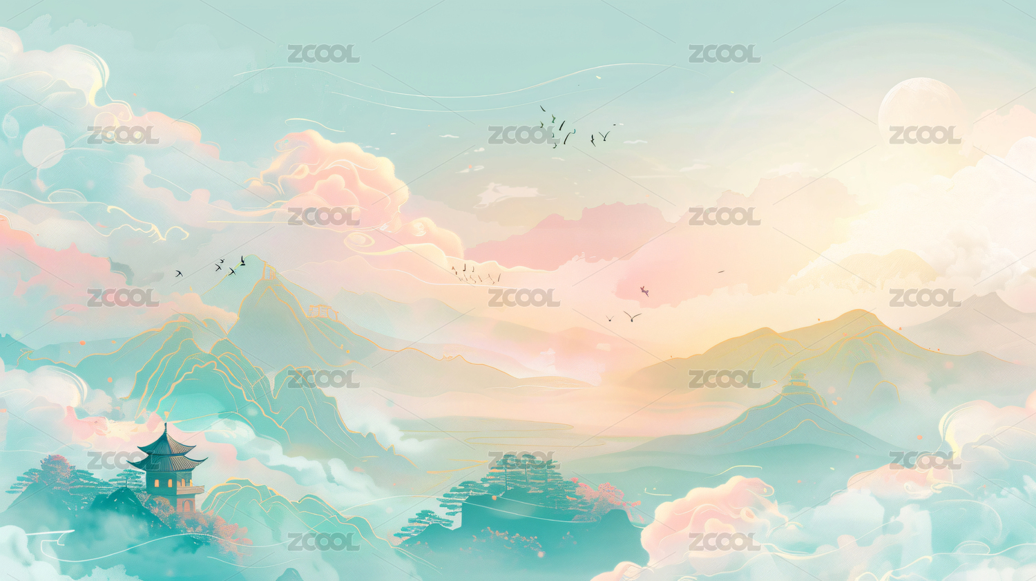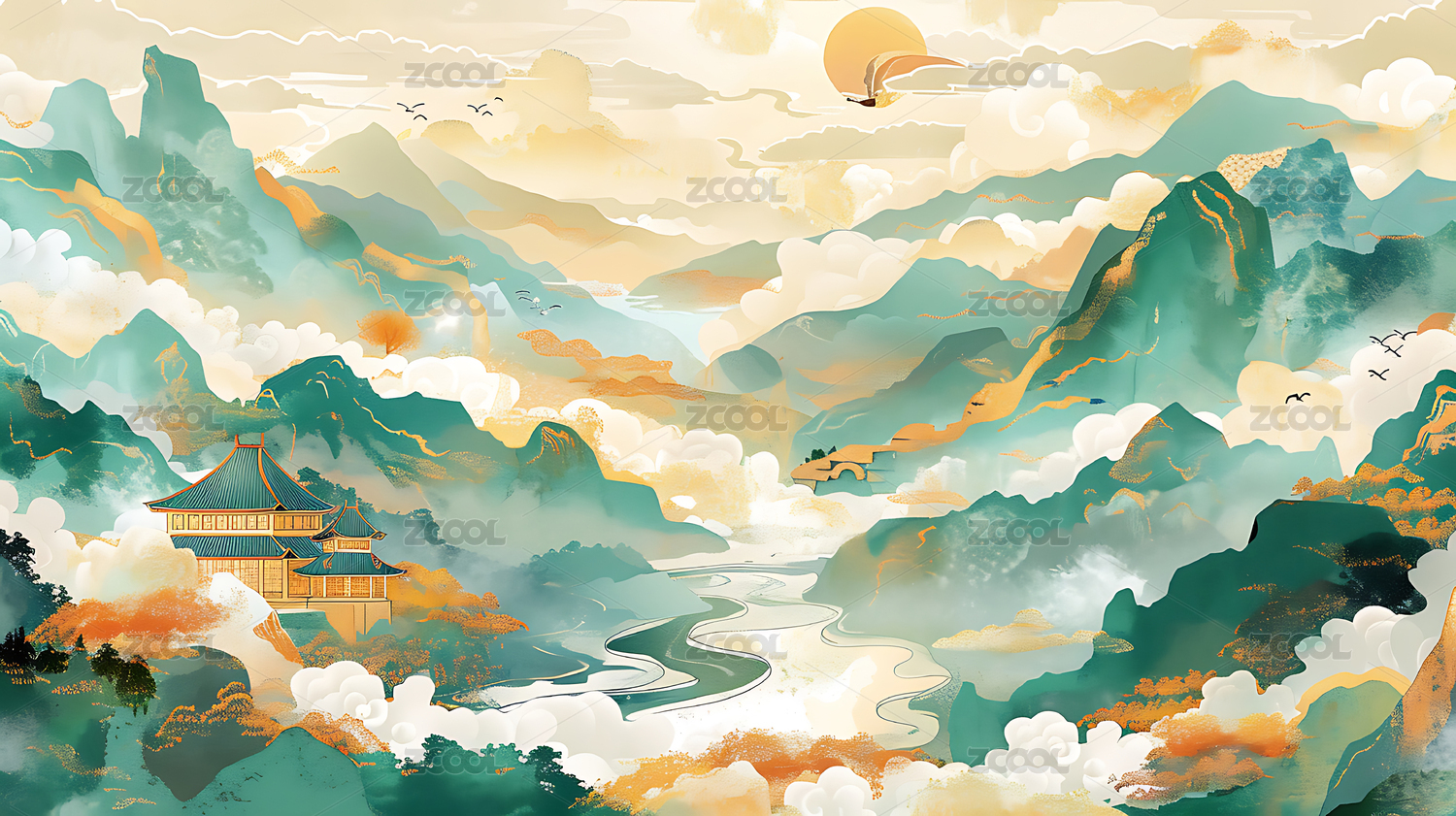山脉亭台楼阁背景