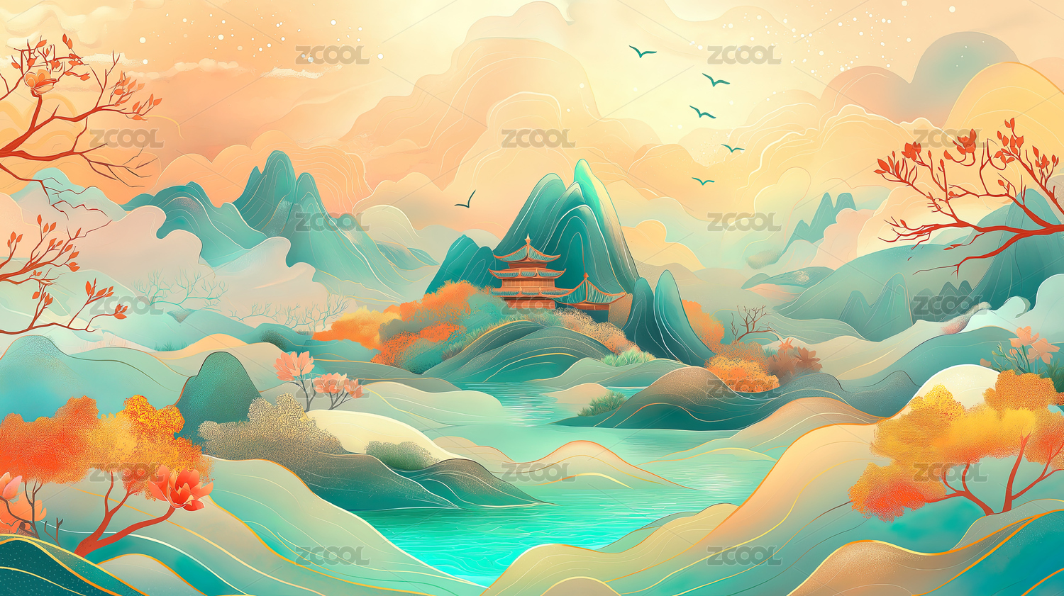 国潮,插画,新中式,中国风,国风,山水画,风景,装饰画,壁纸,背景