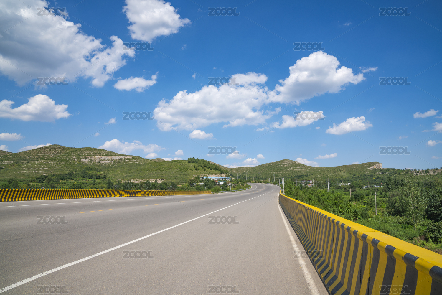 晴朗天气蓝天白云下的山区宽阔的沥青公路
