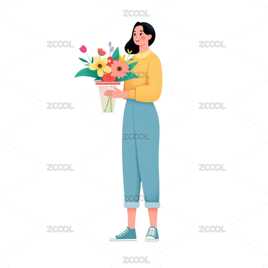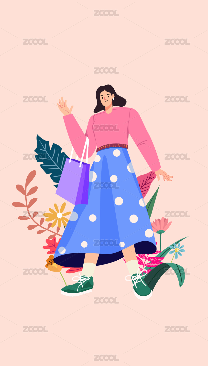 手提购物袋的女人插画 购物袋里长出可爱的植物