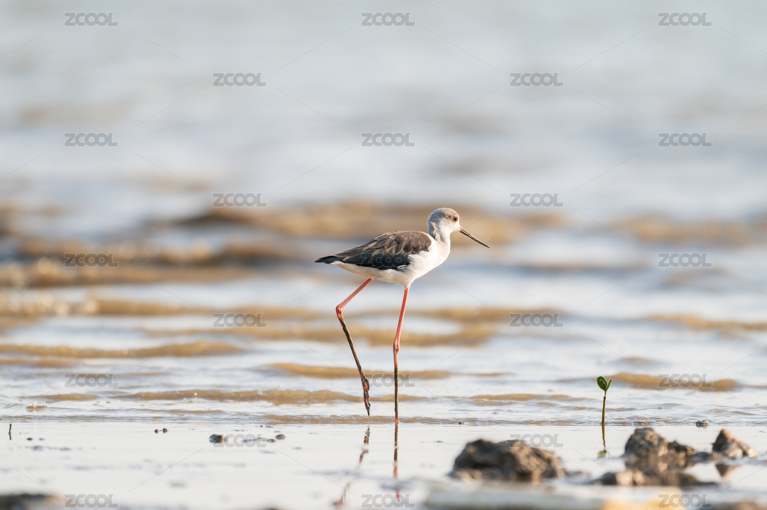 深圳湾公园滩涂上觅食的黑翅长脚鹬