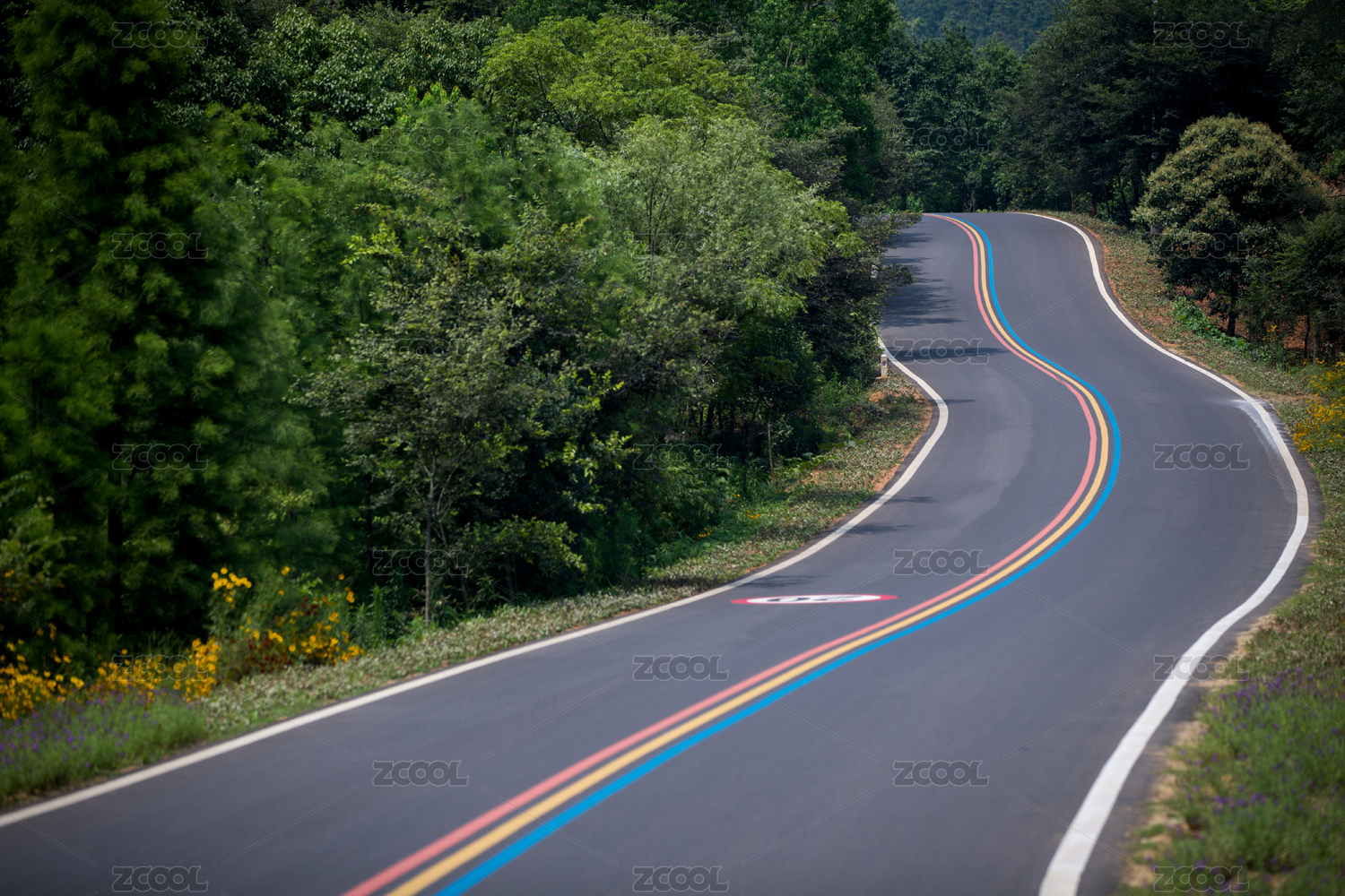 带有红黄蓝三色隔离线的弯曲彩色公路