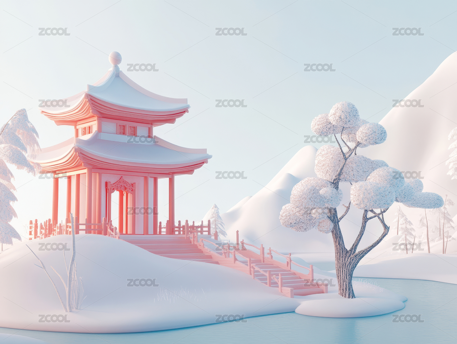 禅意雪景与古寺庙背景