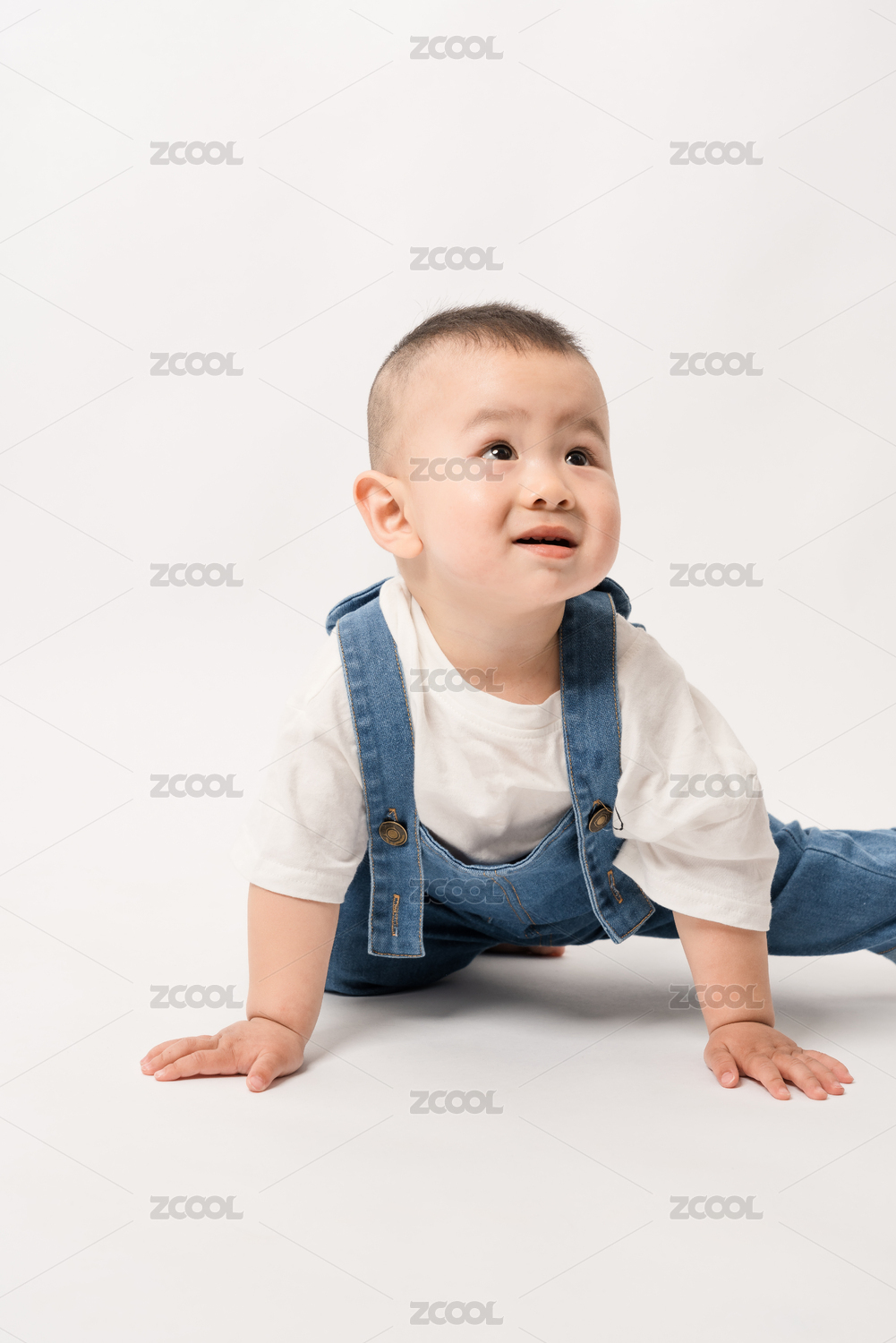 不满周岁的宝宝坐在白色的背景里玩耍和吃苹果