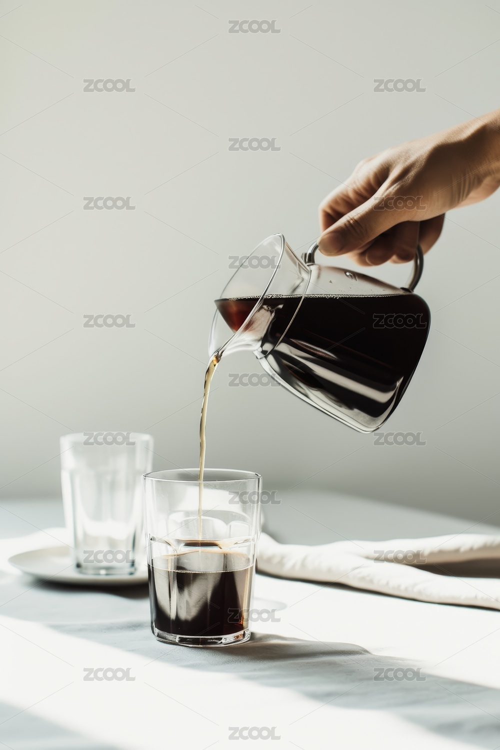 手拿玻璃壶倒咖啡入玻璃杯