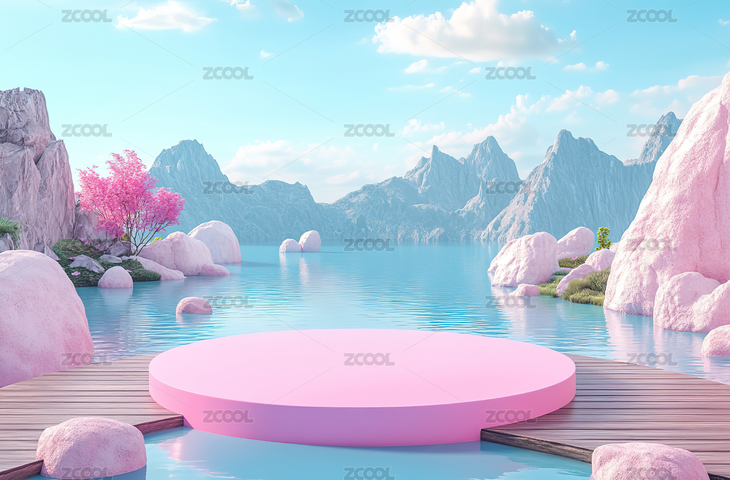 粉色山脉地形湖面与粉色圆形产品展台背景