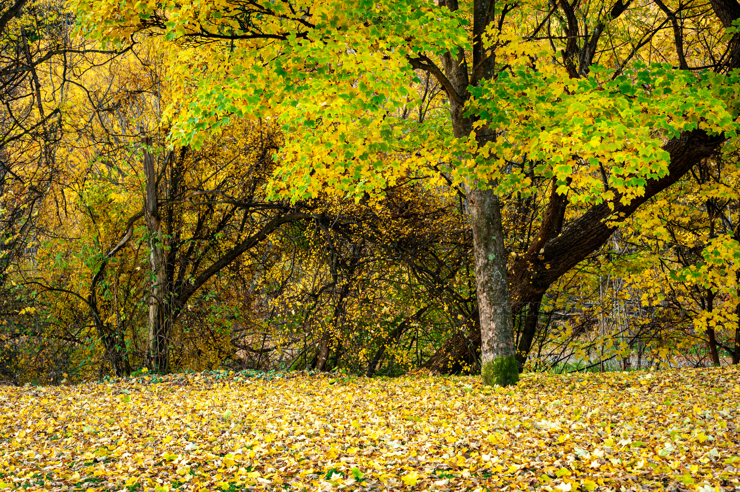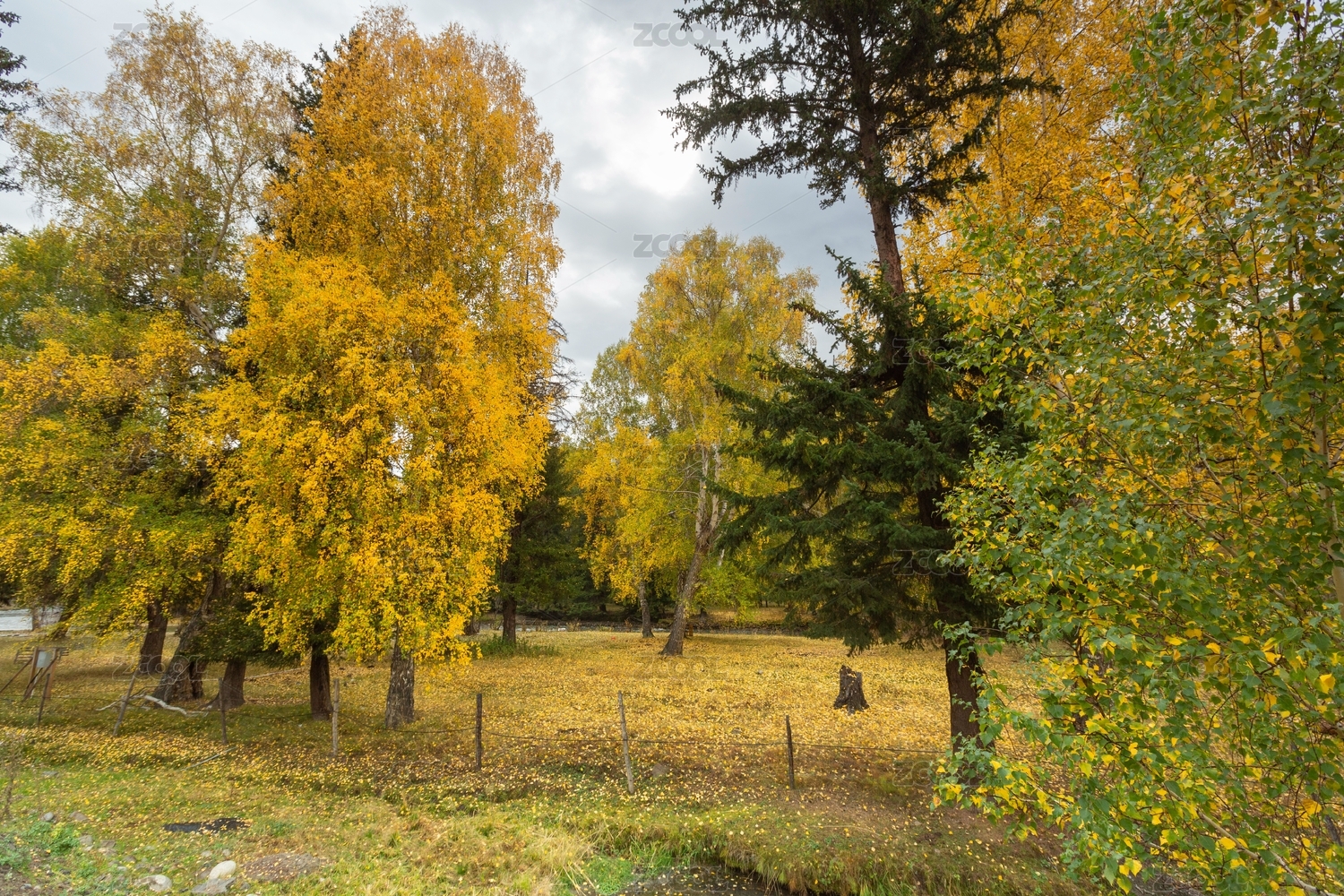 中国新疆喀纳斯秋天黄色的树与满地的落叶