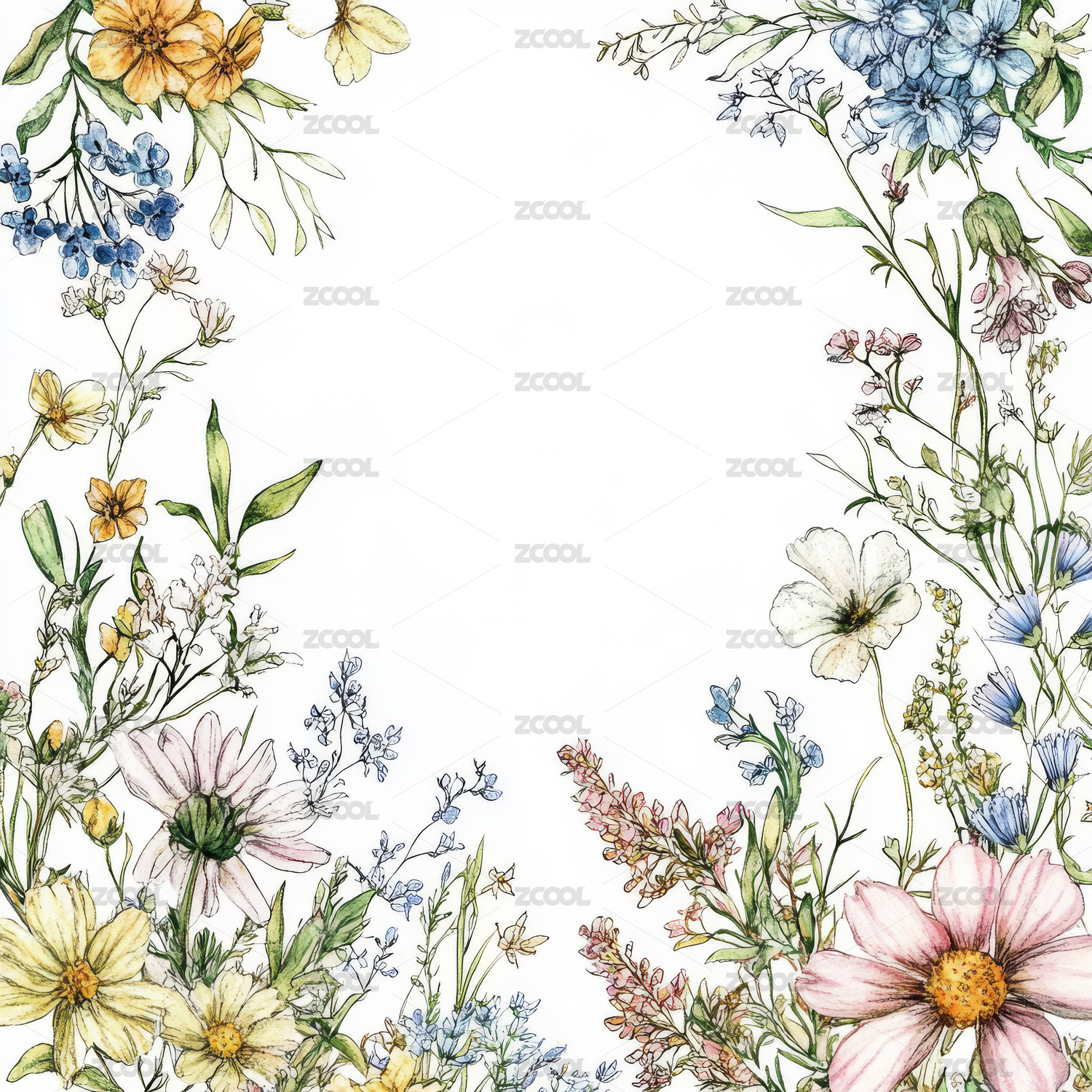 野花环绕的水彩花卉边框