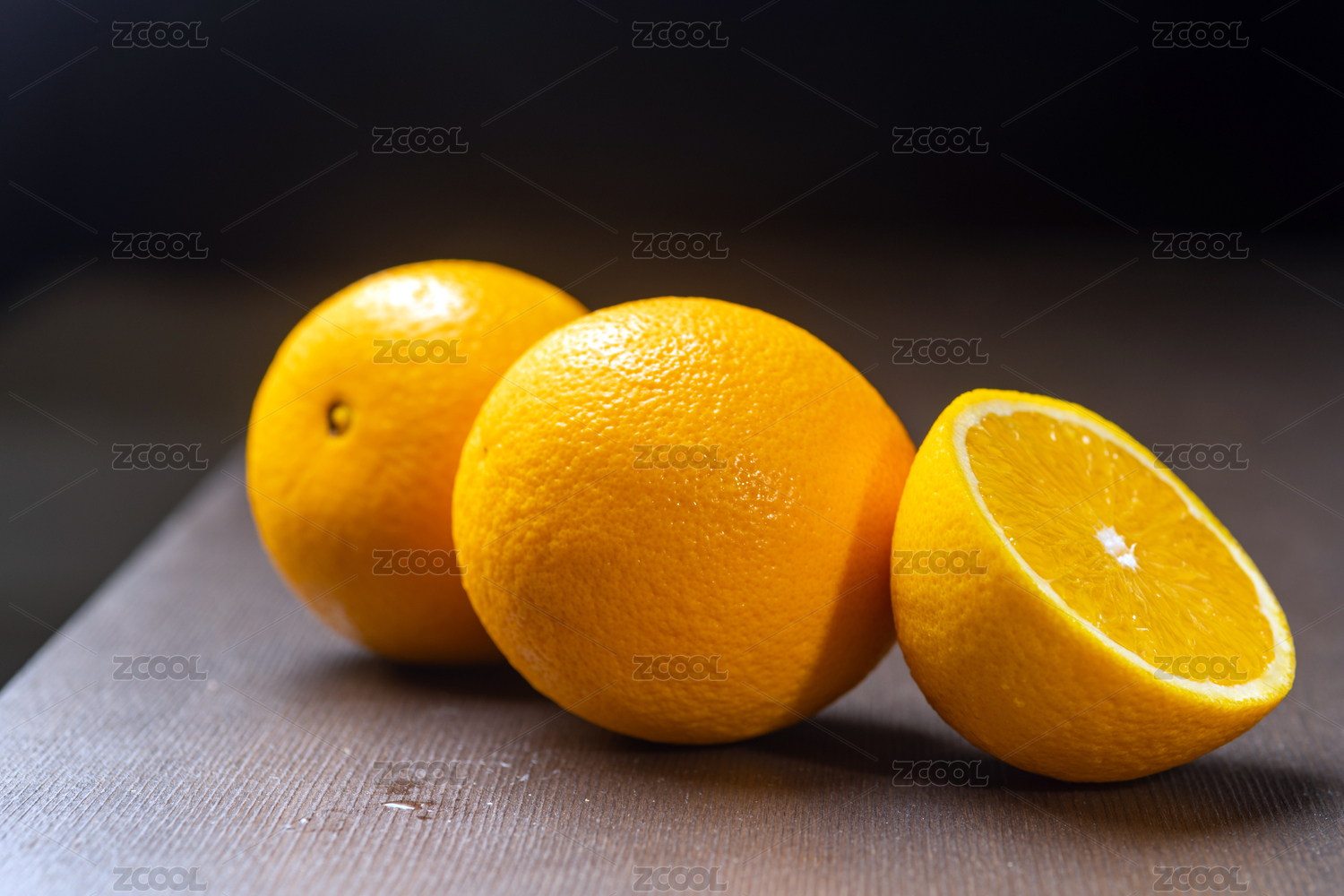切开的橙子和一杯橙汁摆放在木桌面上深色调