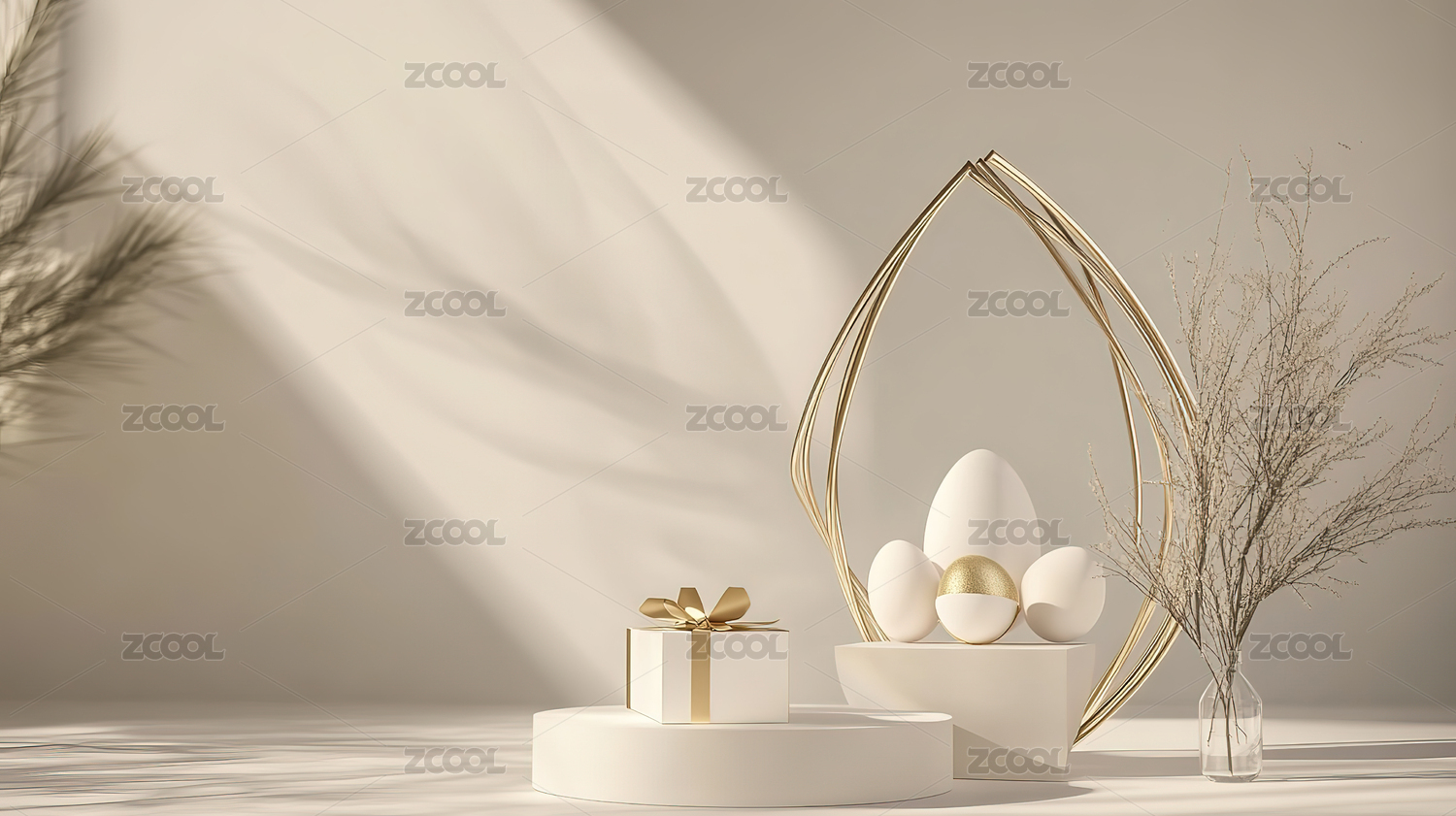 白色背景下桌子上的鸡蛋和礼物特写镜头