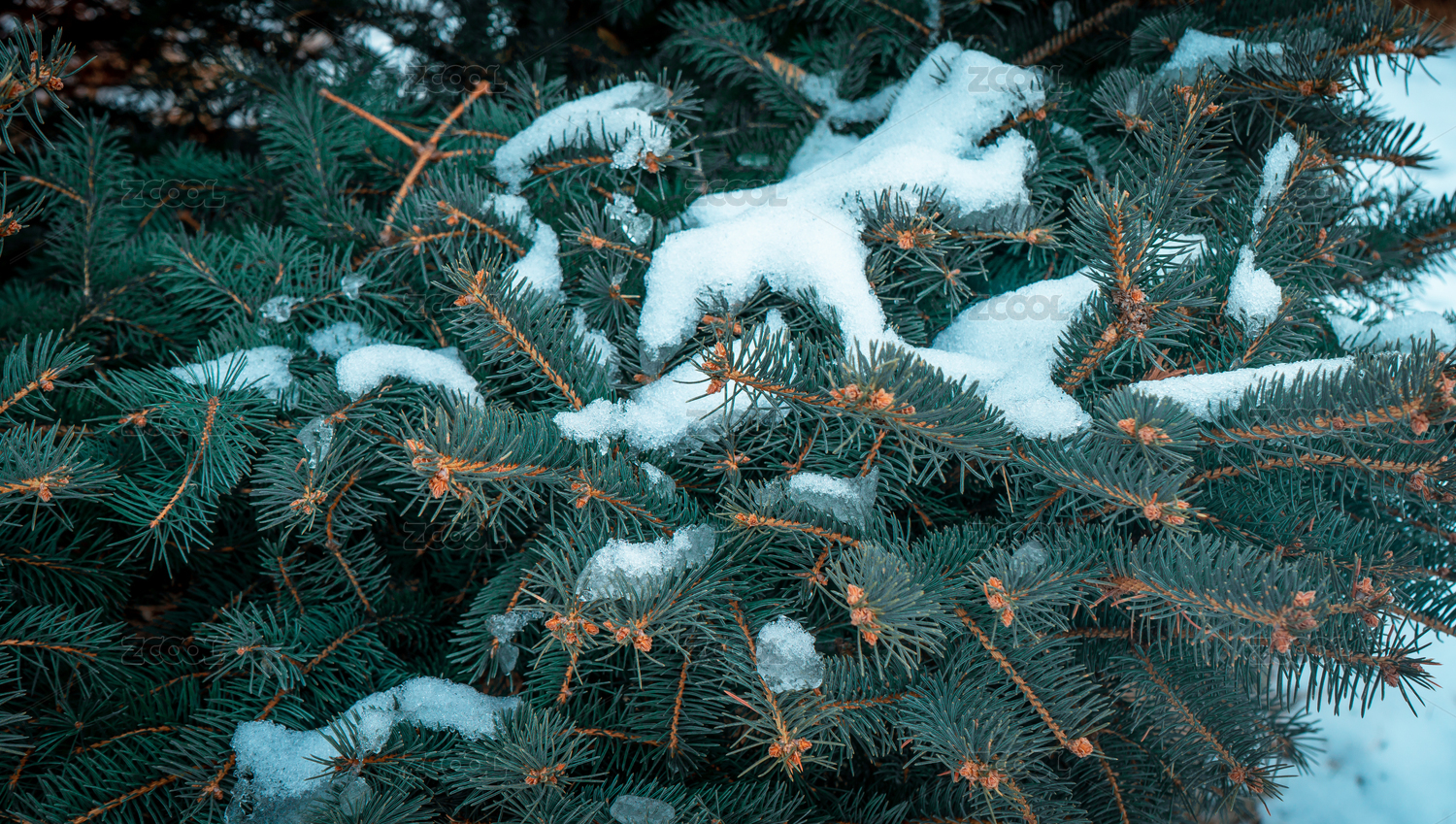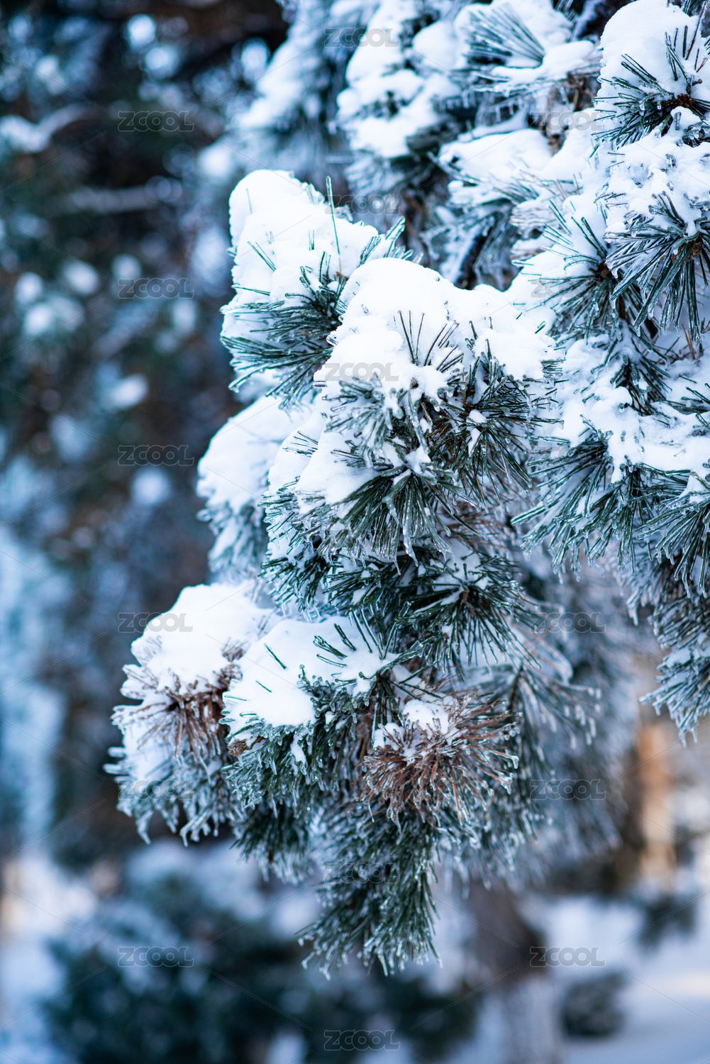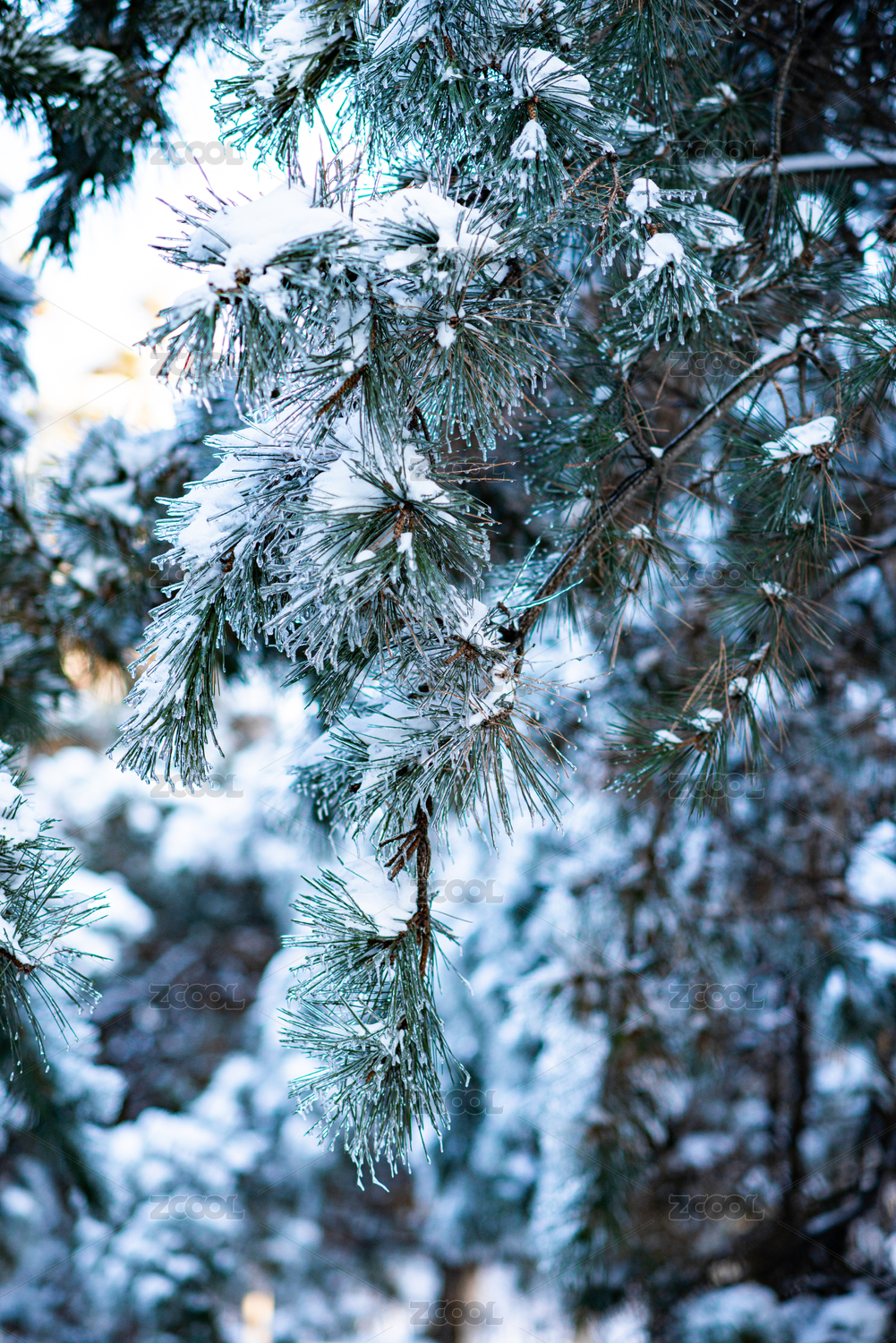 冬天冰雪过后的雪地上被雪覆盖的松树