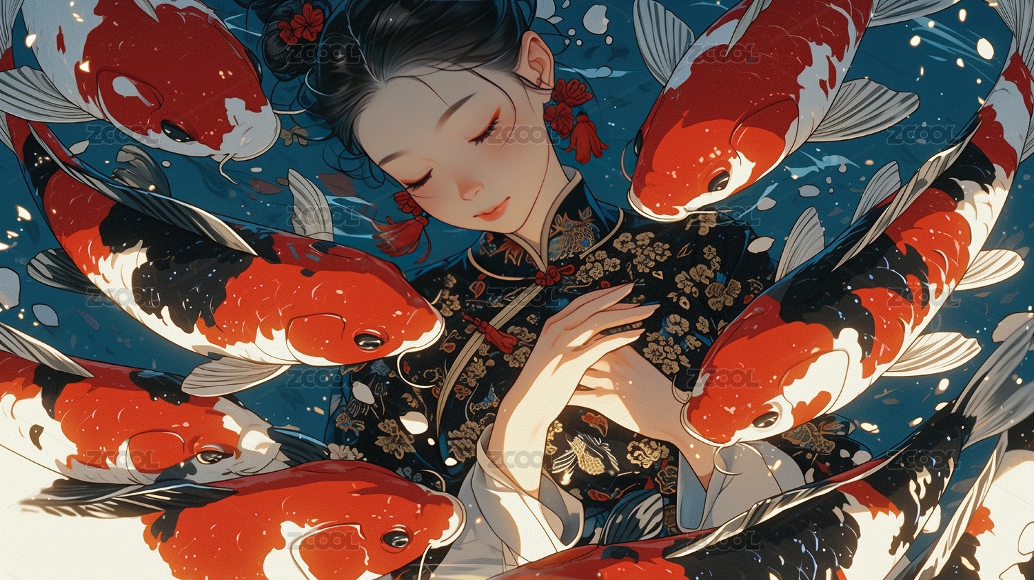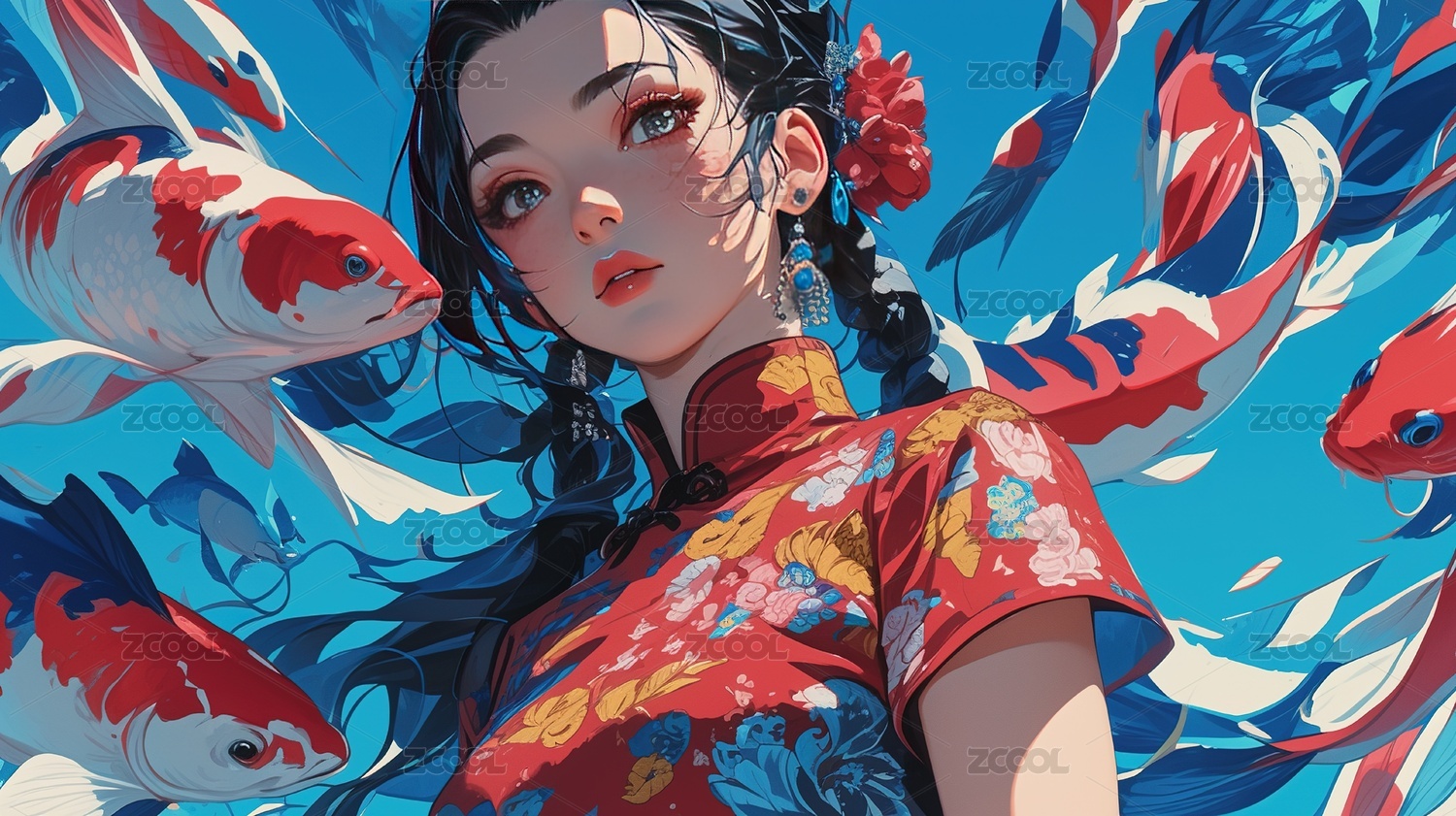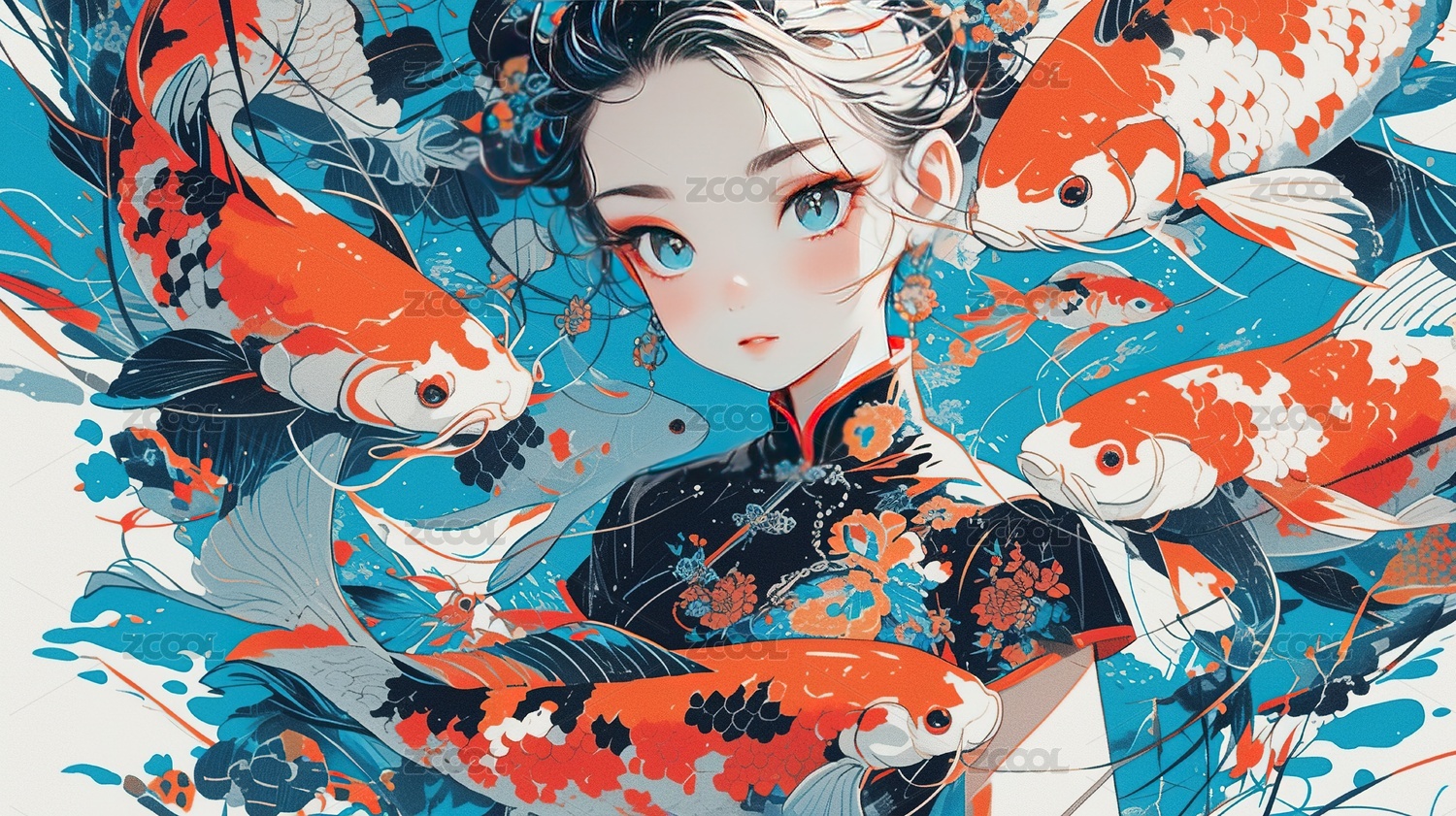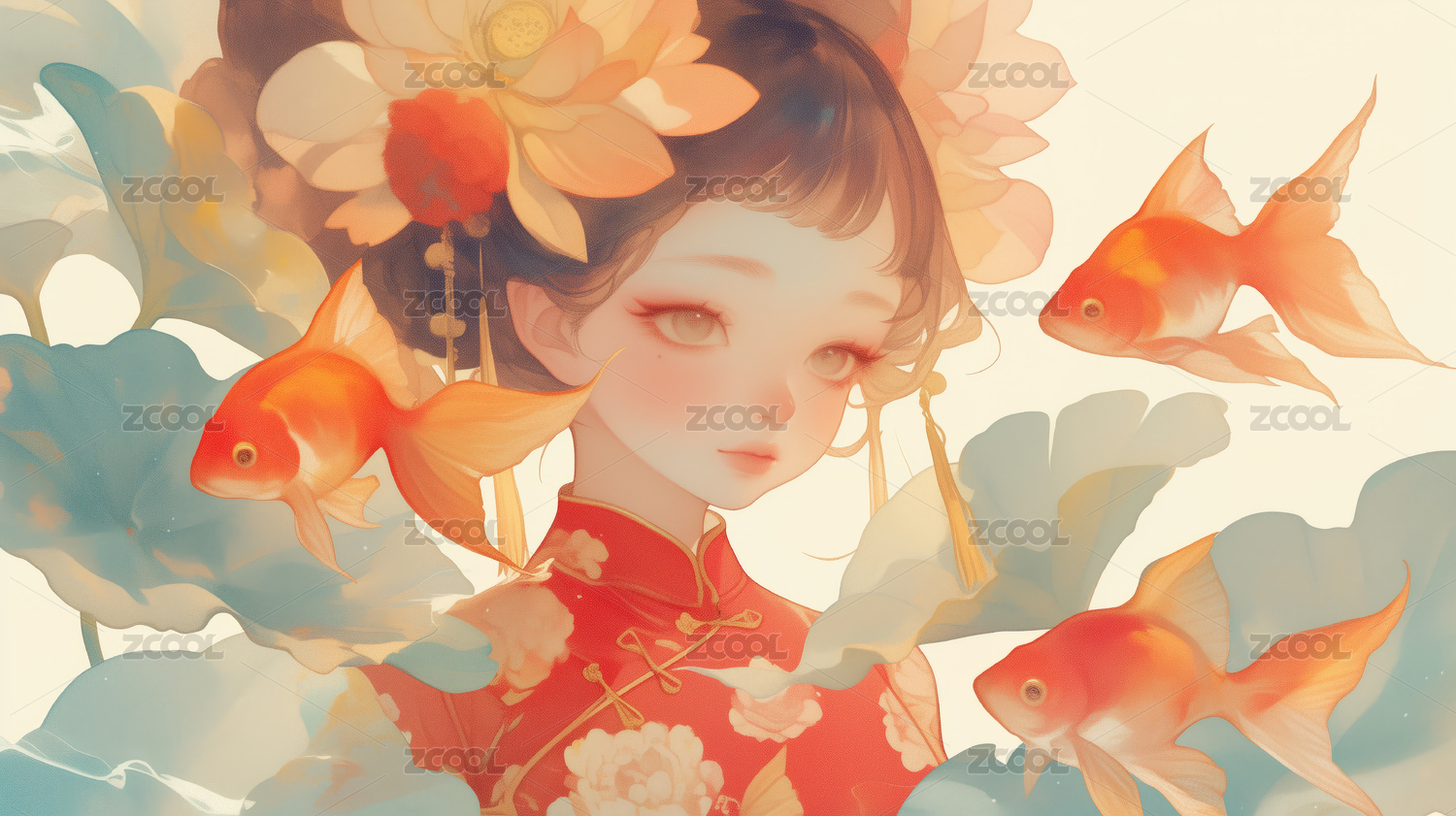 女人,美女,汉服,国风,肖像,鲤鱼,锦鲤,旗袍,女孩