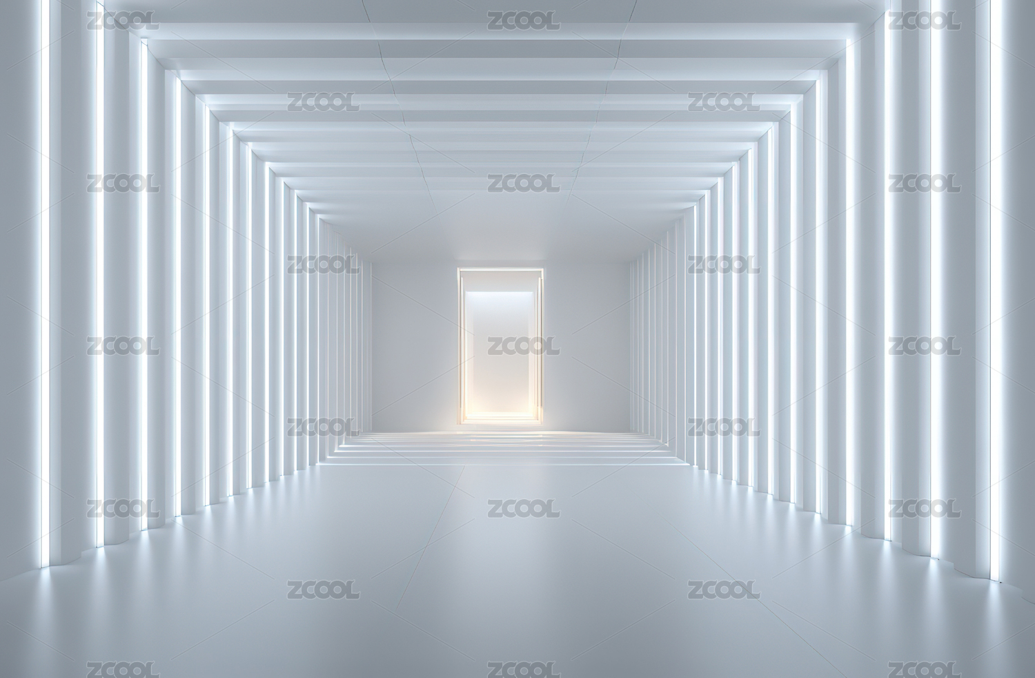 未来感深蓝色调与霓虹灯矩形框架室内场景