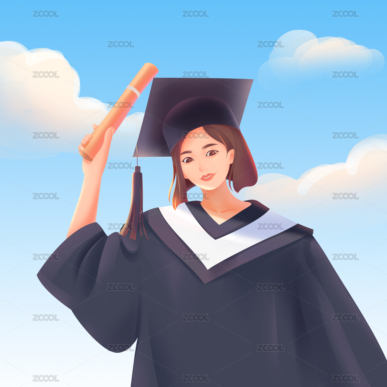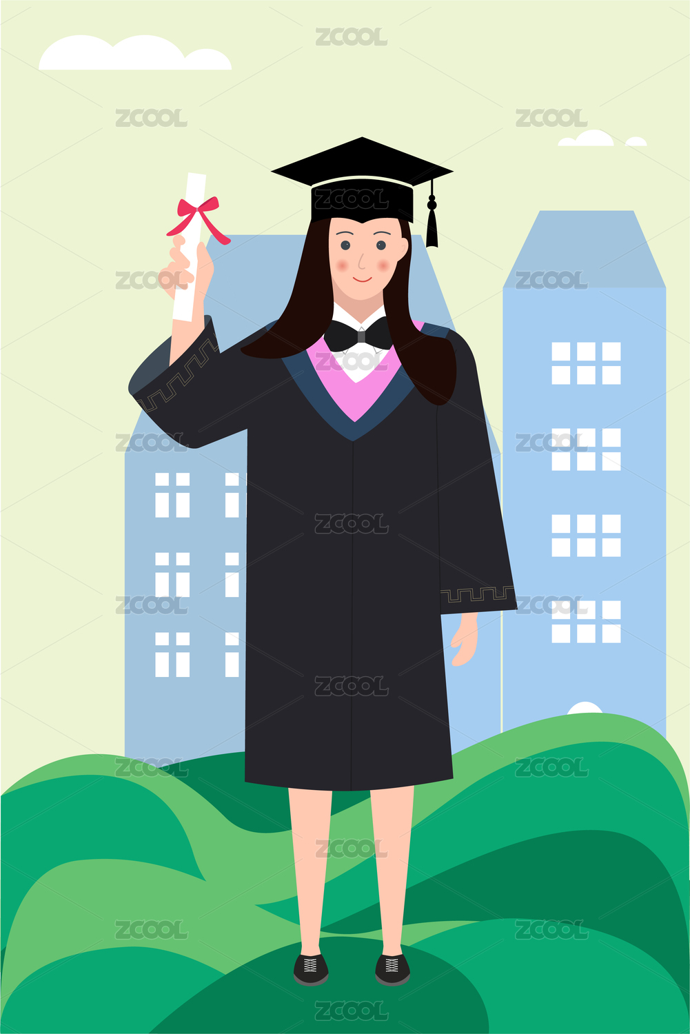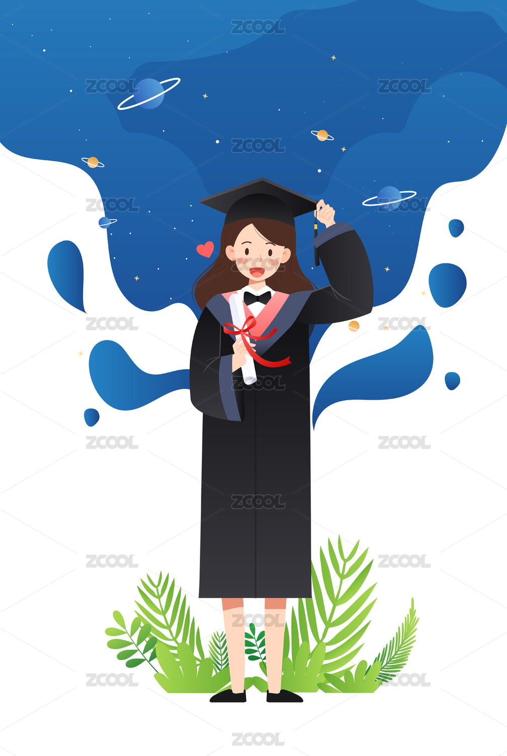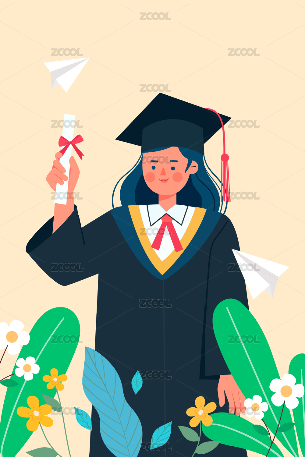 毕业主题插画穿着学士服滑滑板的男孩和手拿