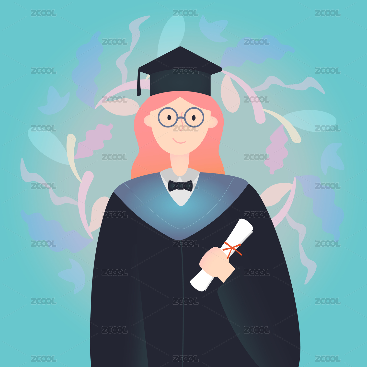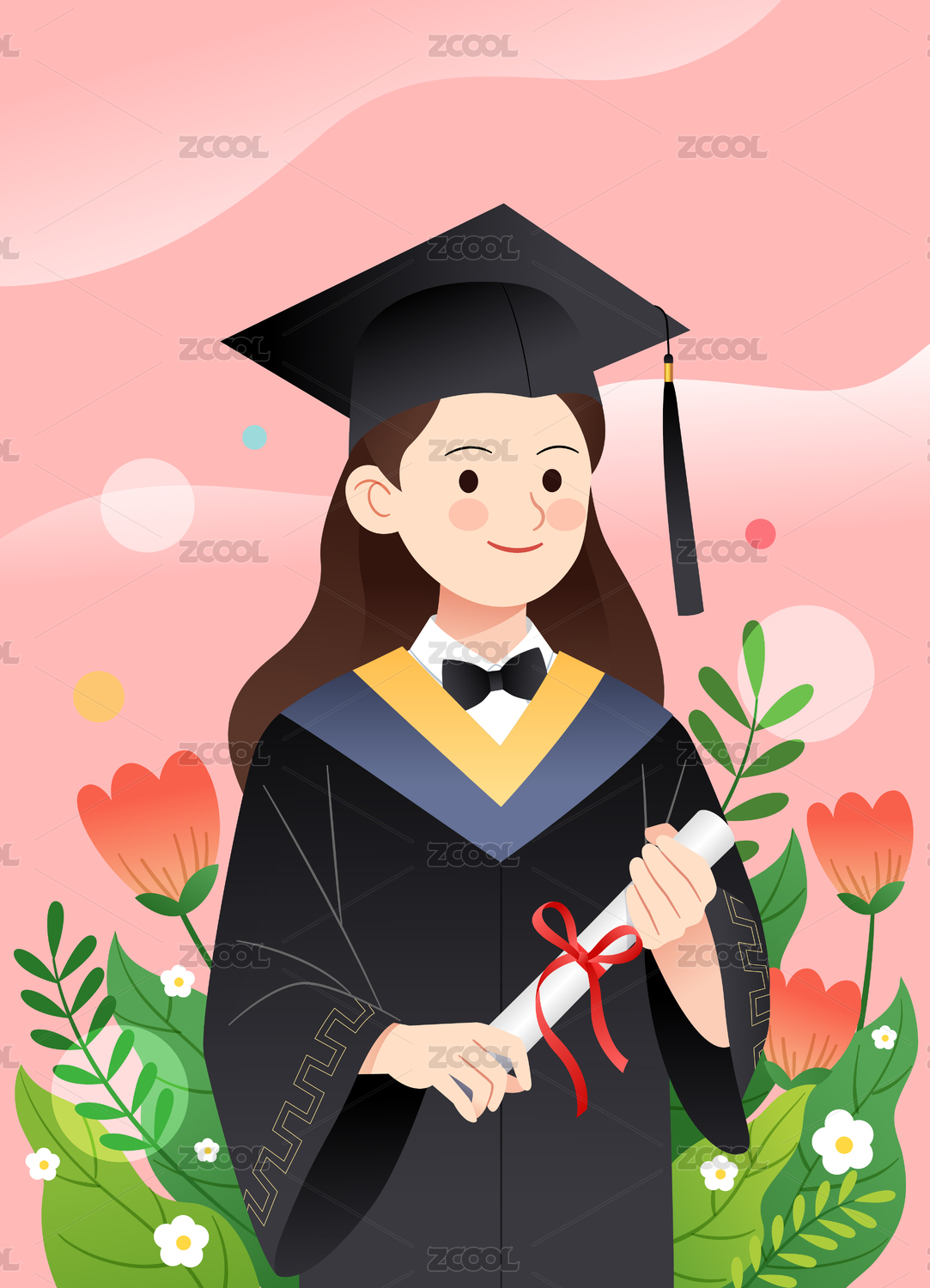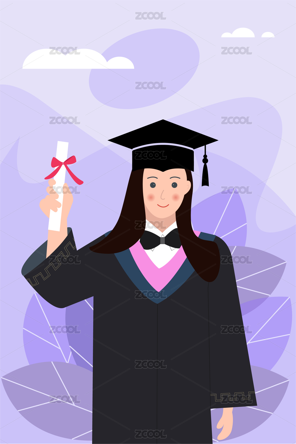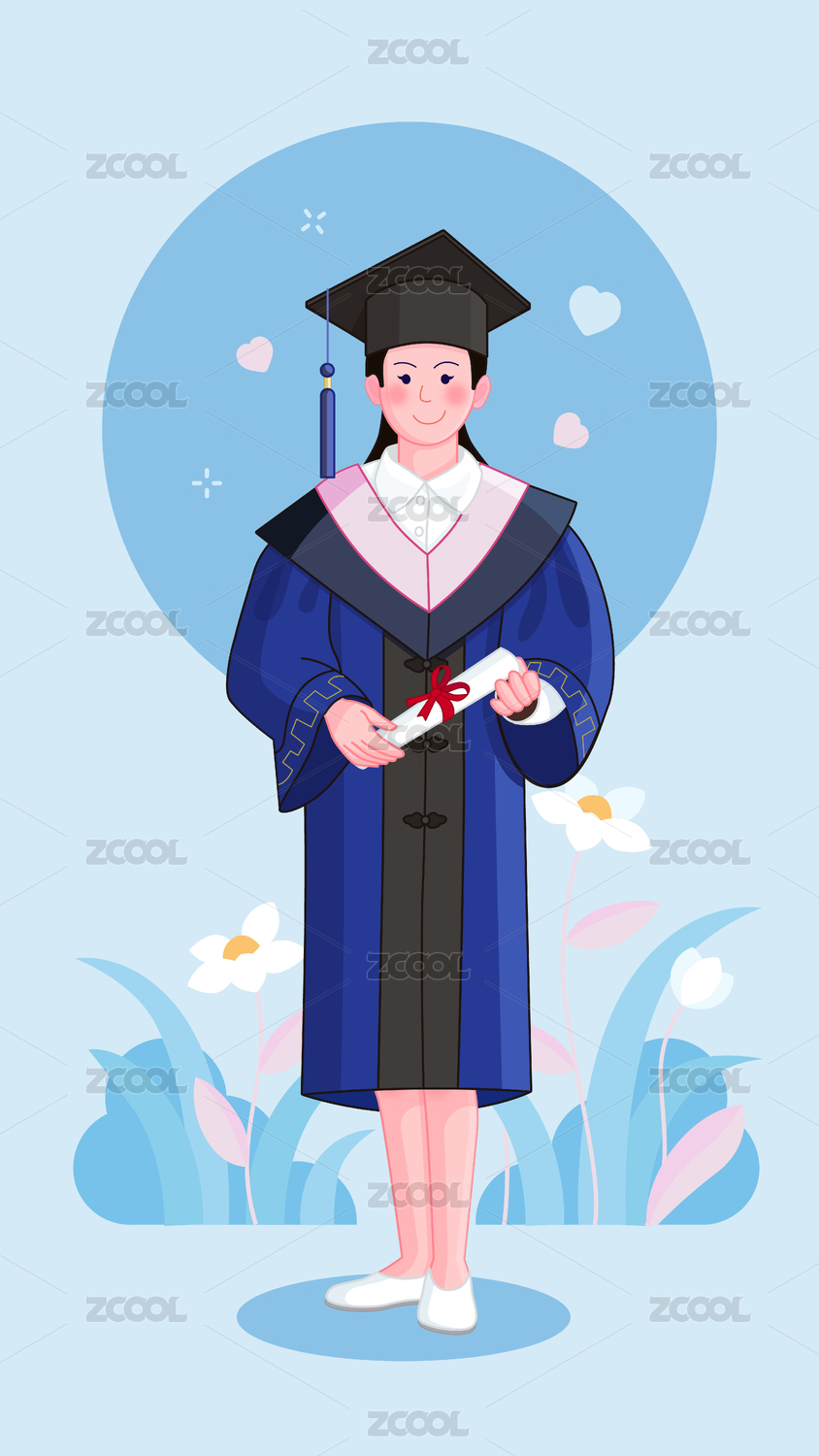 毕业主题插画穿着学士服滑滑板的男孩和手拿