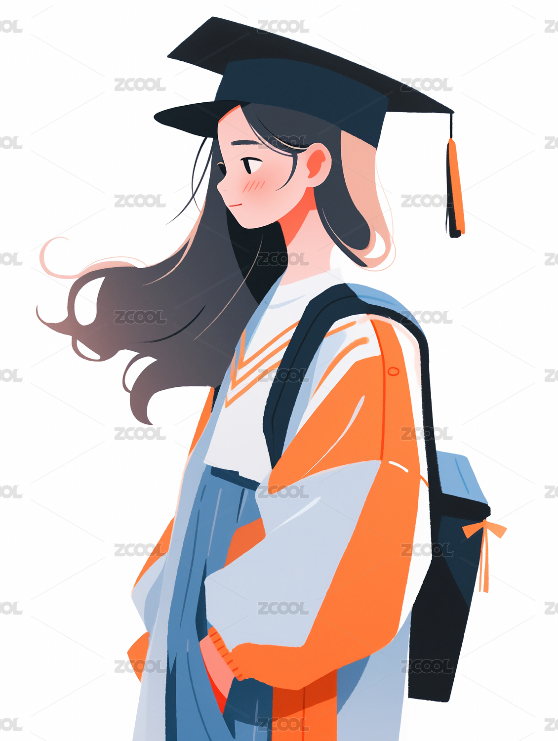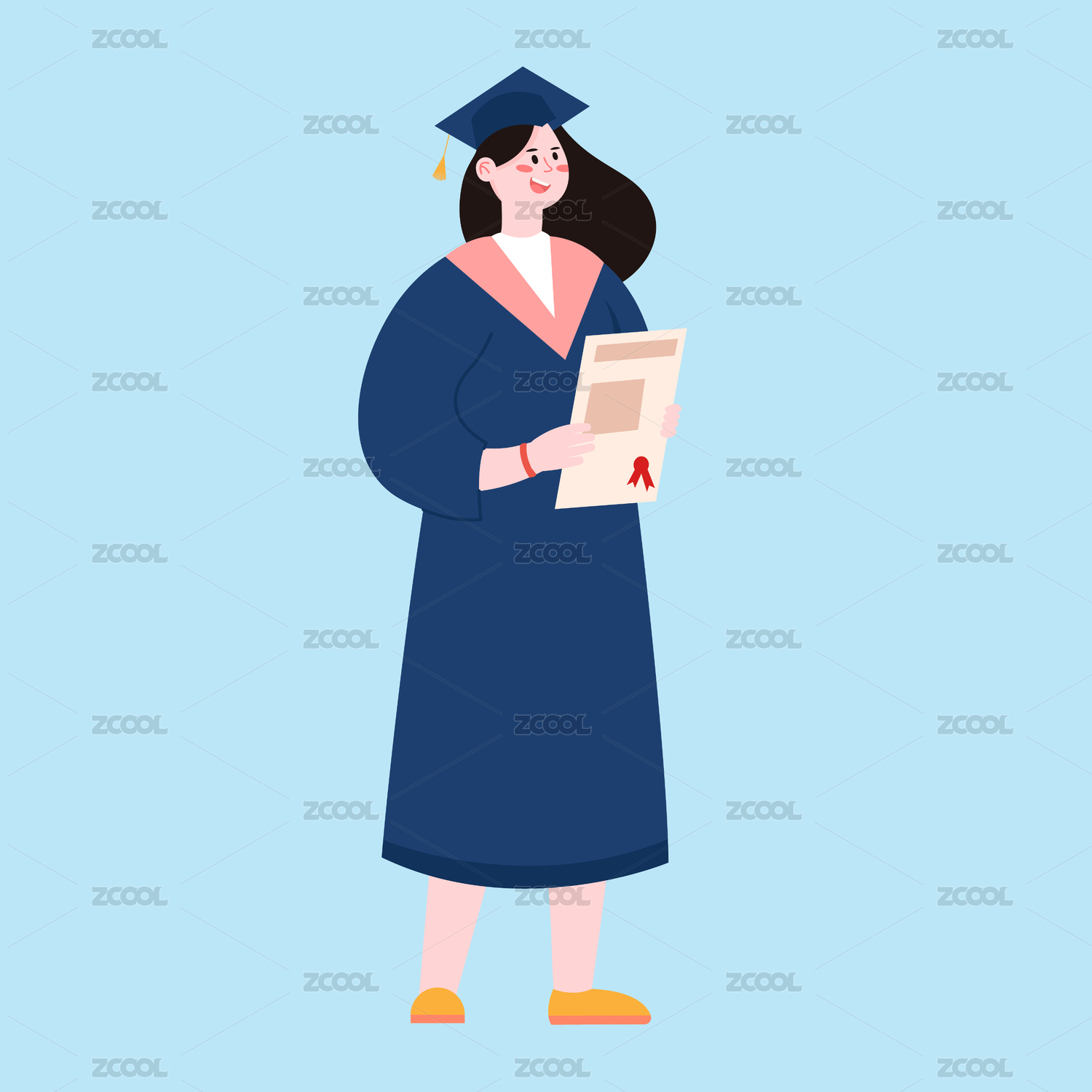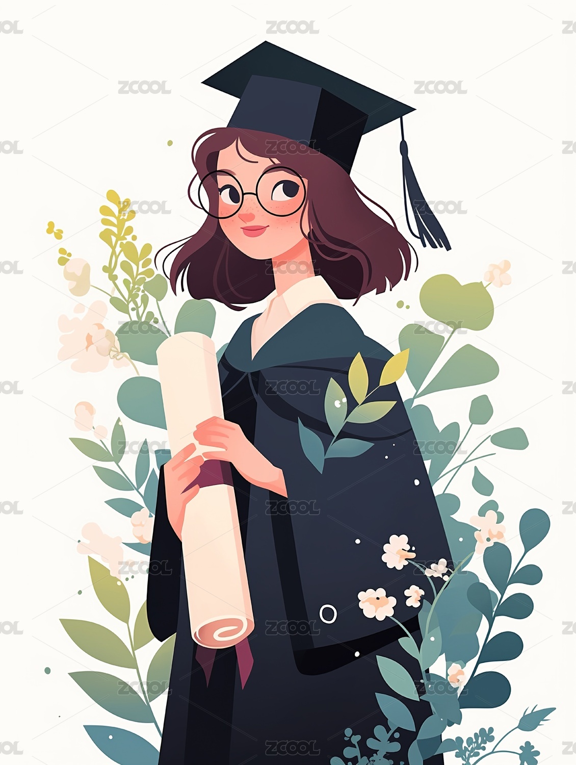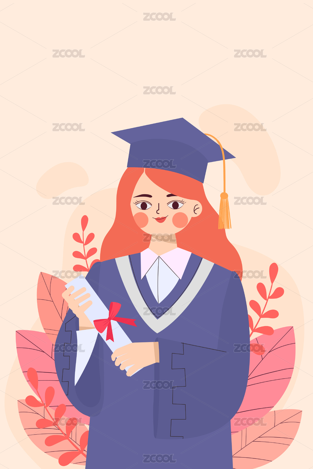 毕业主题插画穿着学士服滑滑板的男孩和手拿