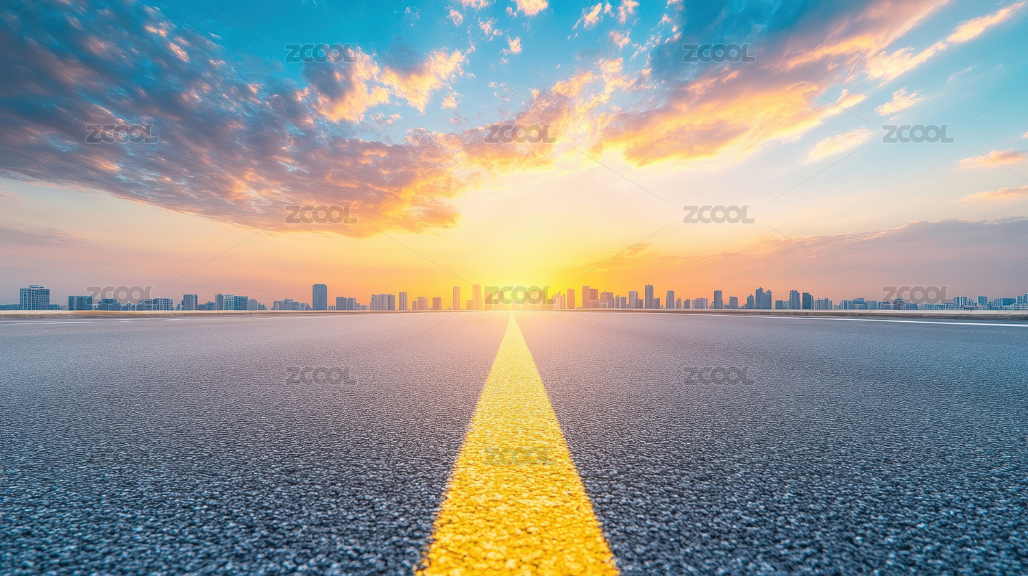 日落时分的城市天际线与空旷的道路