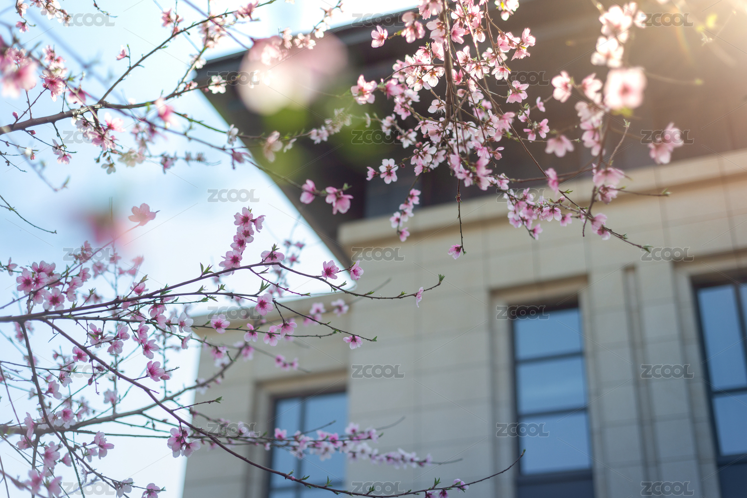 江苏南京粉色花树掩映中蓝色玻璃窗现代建筑