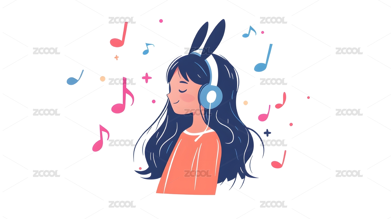 戴耳机听音乐的女孩卡通插画
