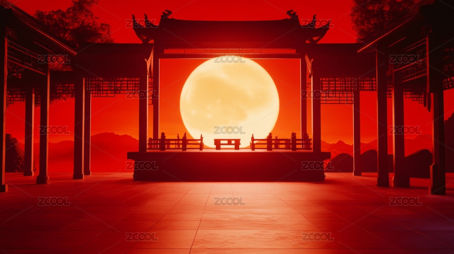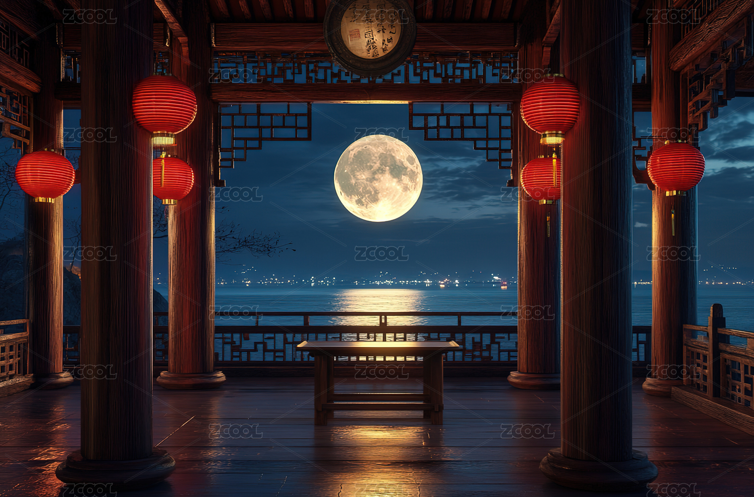中秋圆月下的亭台楼阁