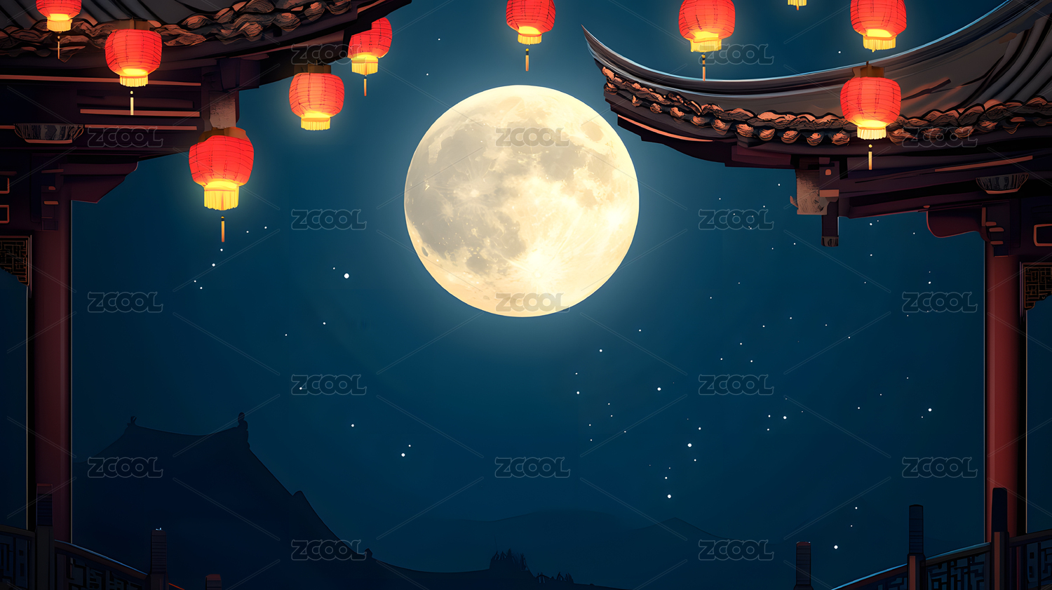 中秋节插图中式门庭后在月亮