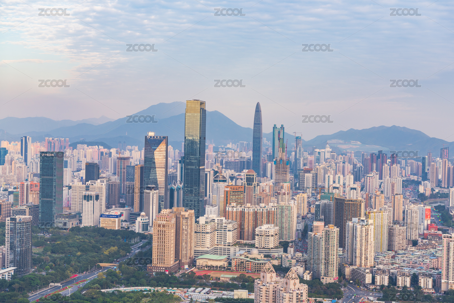 黄昏下的中国广东省深圳城市天际线建筑群高楼大厦风光