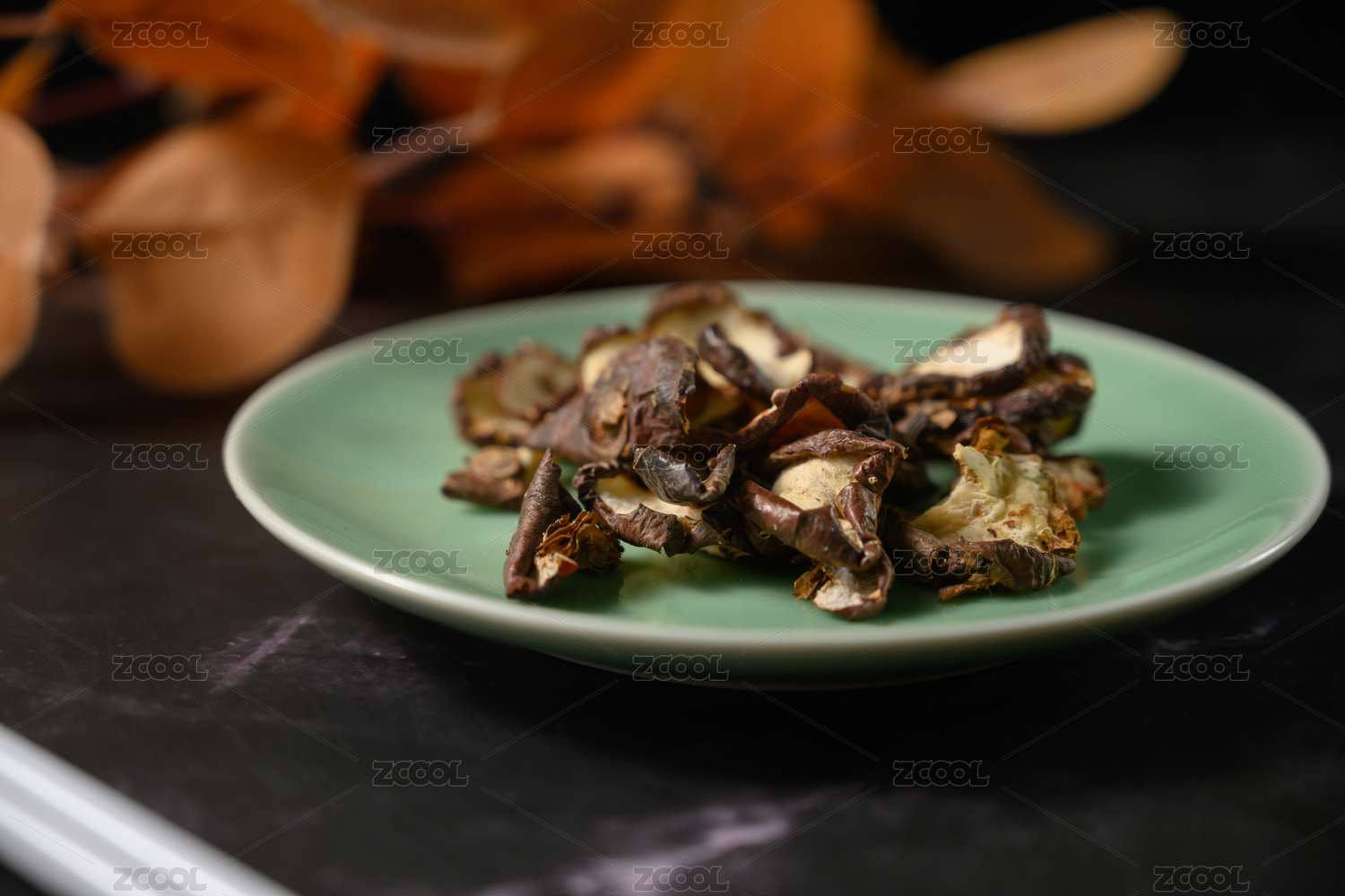 桌面上的盘子里的美味可口的陈皮白茶叶