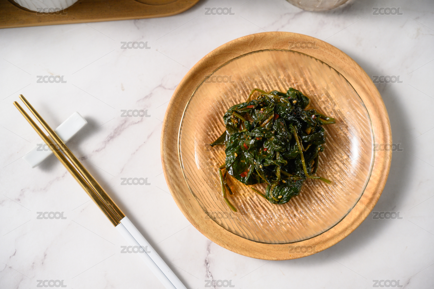 桌面上的盘子里的美味可口的凉拌苏子叶