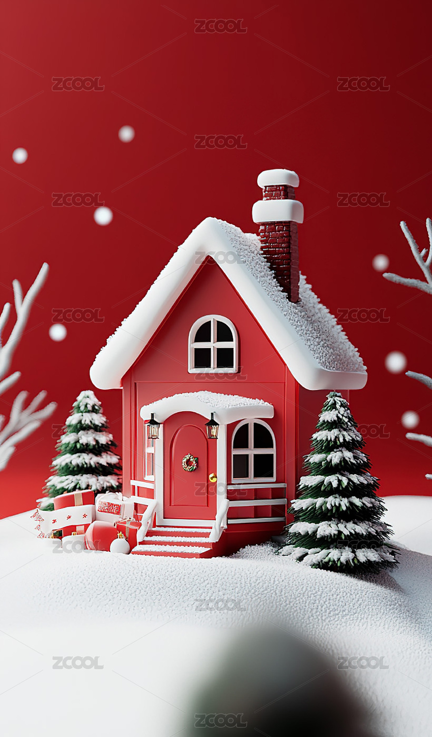 一座鲜艳的红色房子被柔软的雪覆盖
