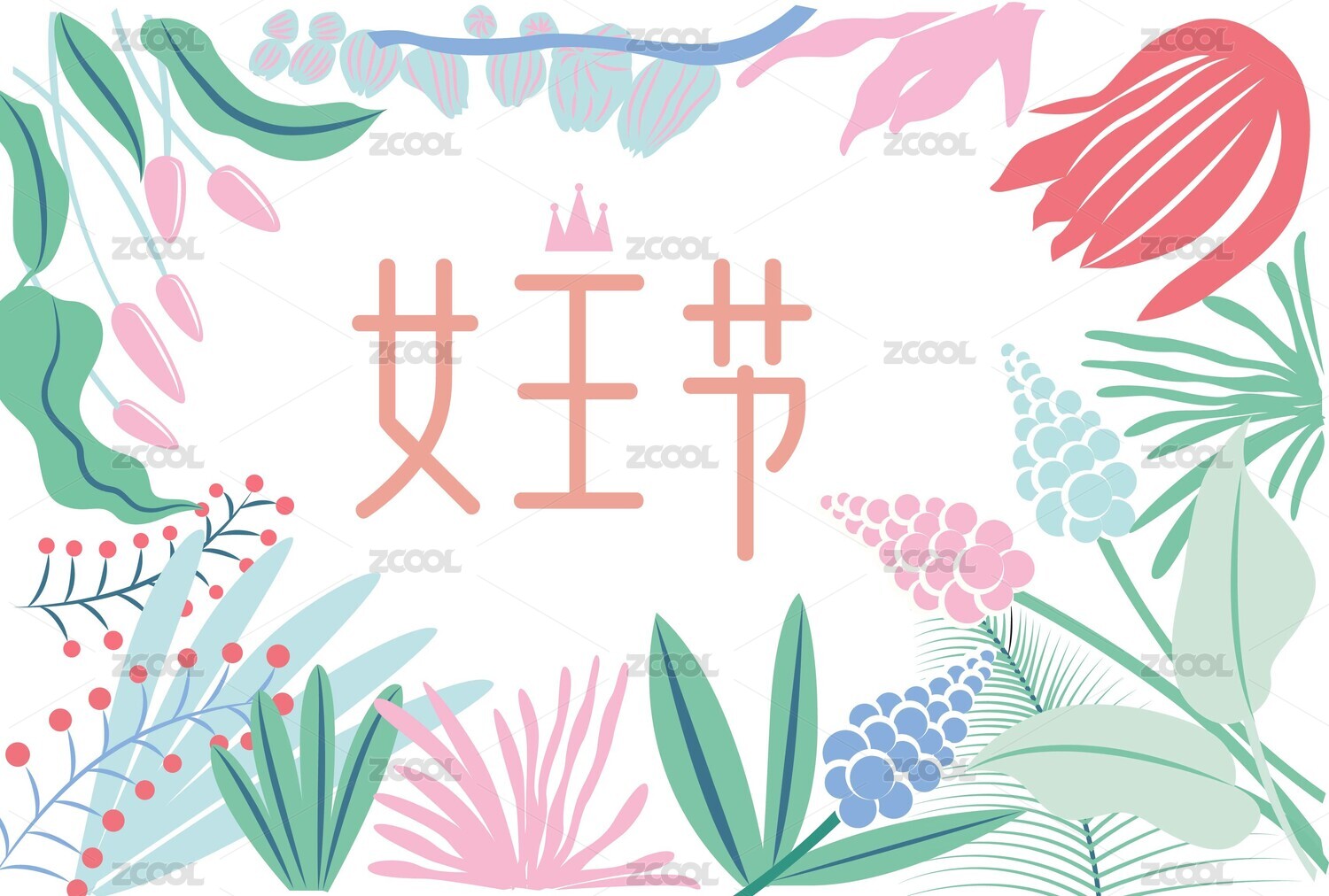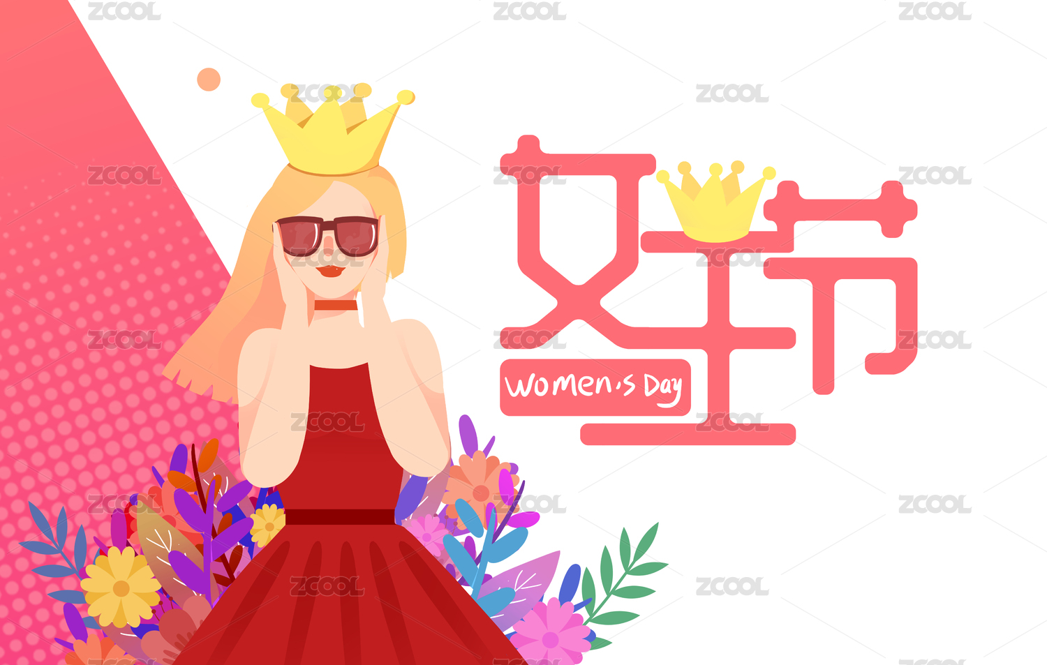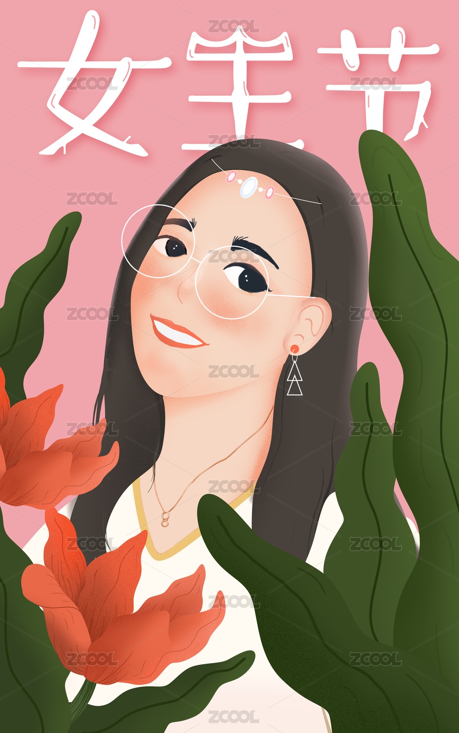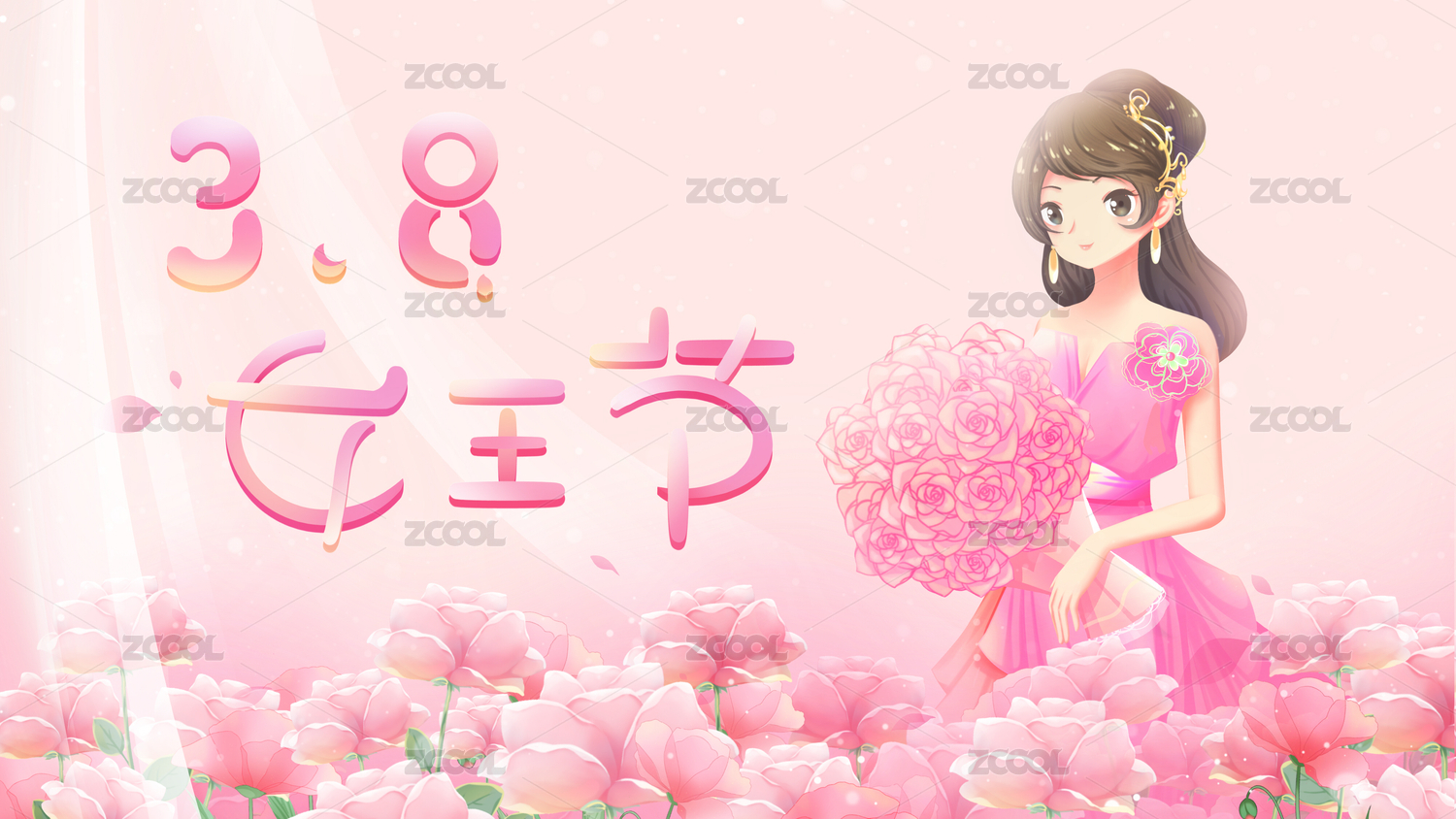粉色唯美女王节海报 花丛中捧着玫瑰的少女