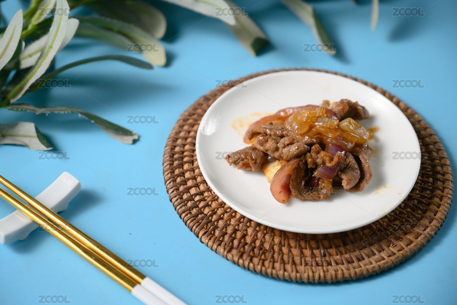 桌面上的盘子里的美味可口的洋葱牛肉