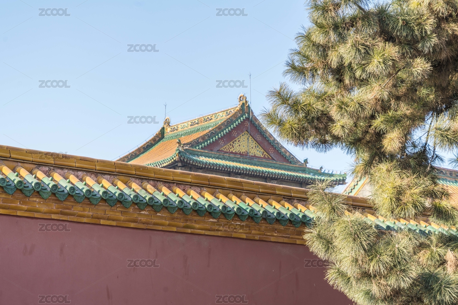 中国北京故宫博物院古建一角——红墙琉璃瓦屋顶、瑞兽