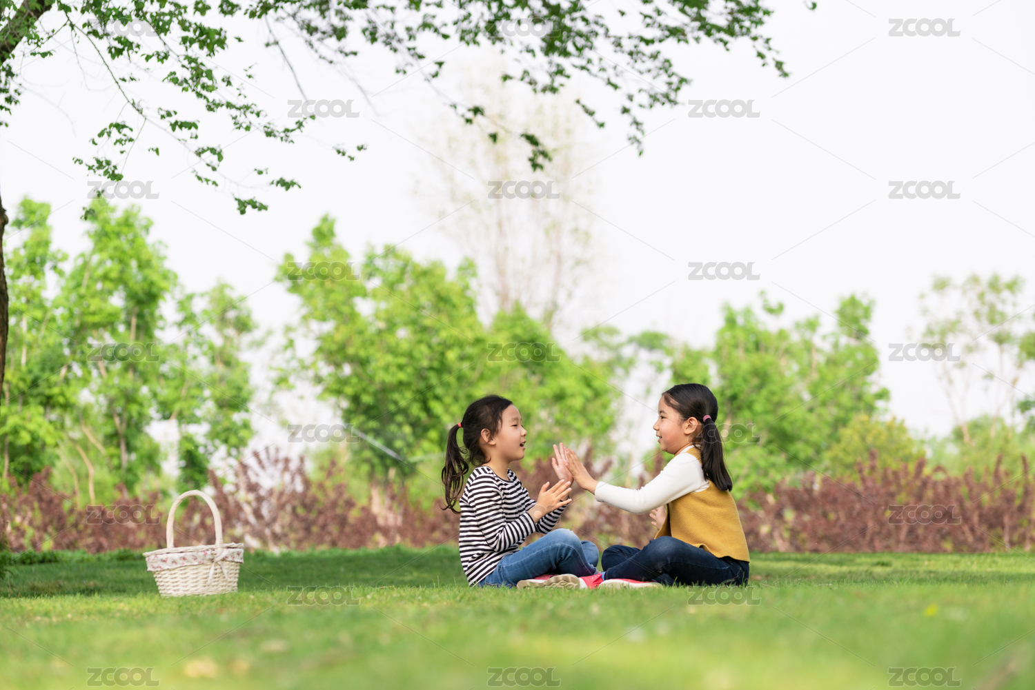 两个坐在树下玩拍手游戏的女孩