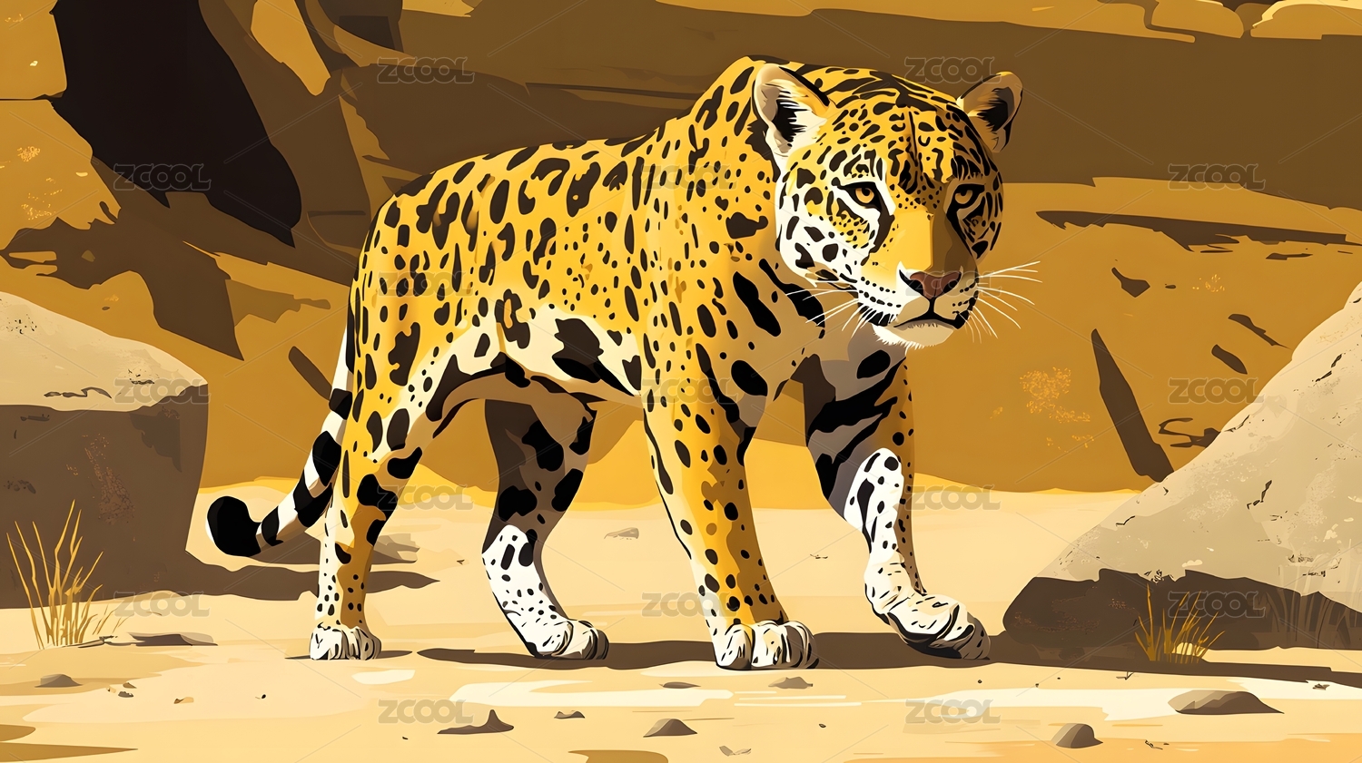 动物,插画,森林,植物,猎豹,草原,天空,夕阳