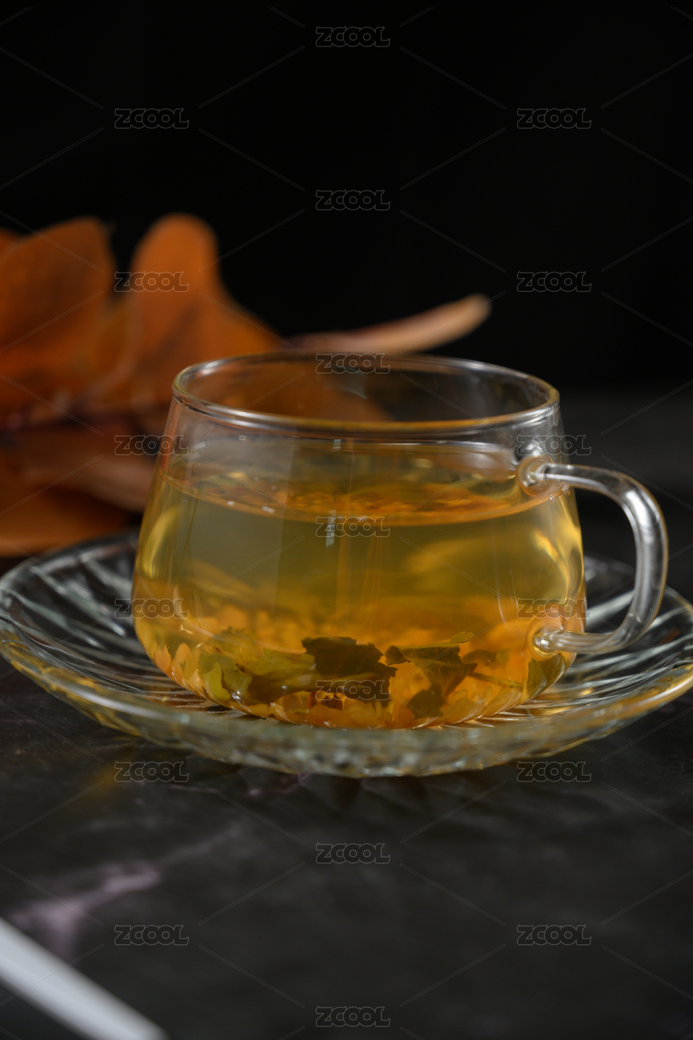 桌面上的杯子里的甘甜可口的茶花花茶