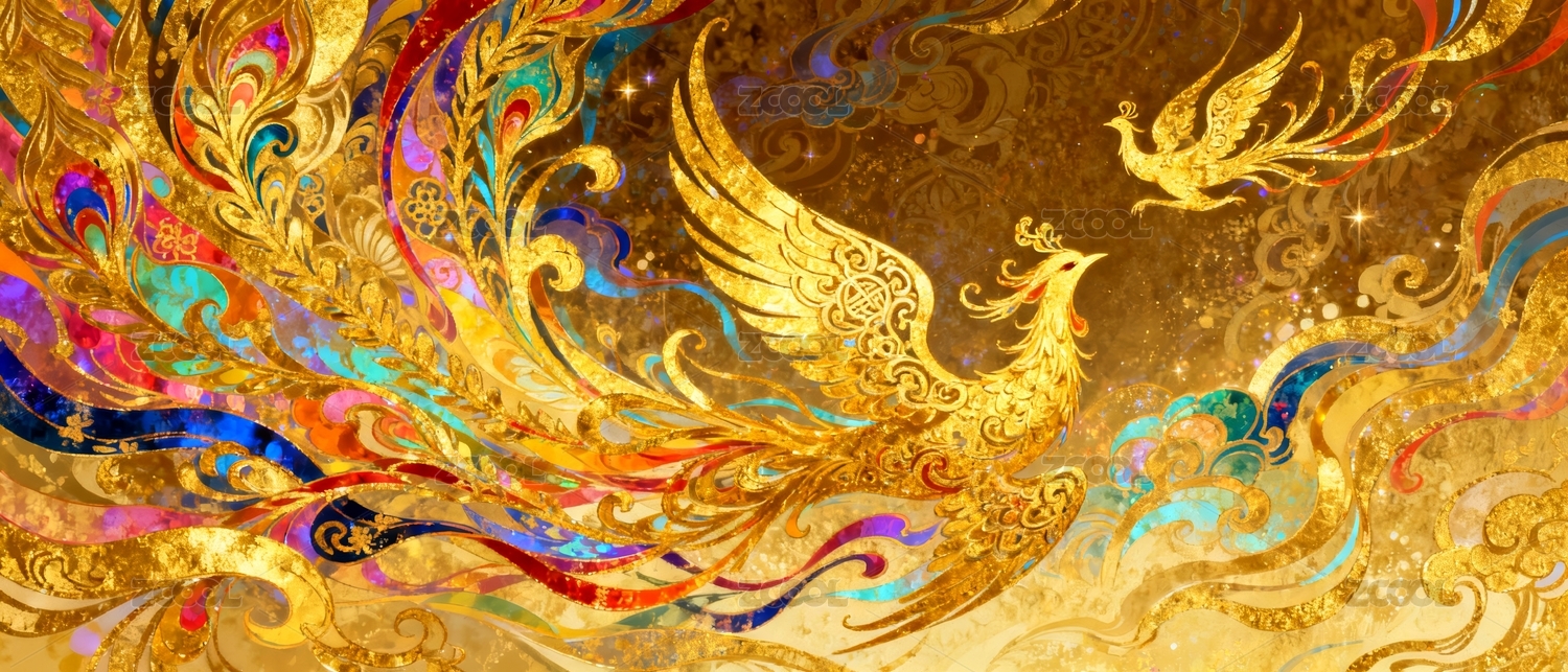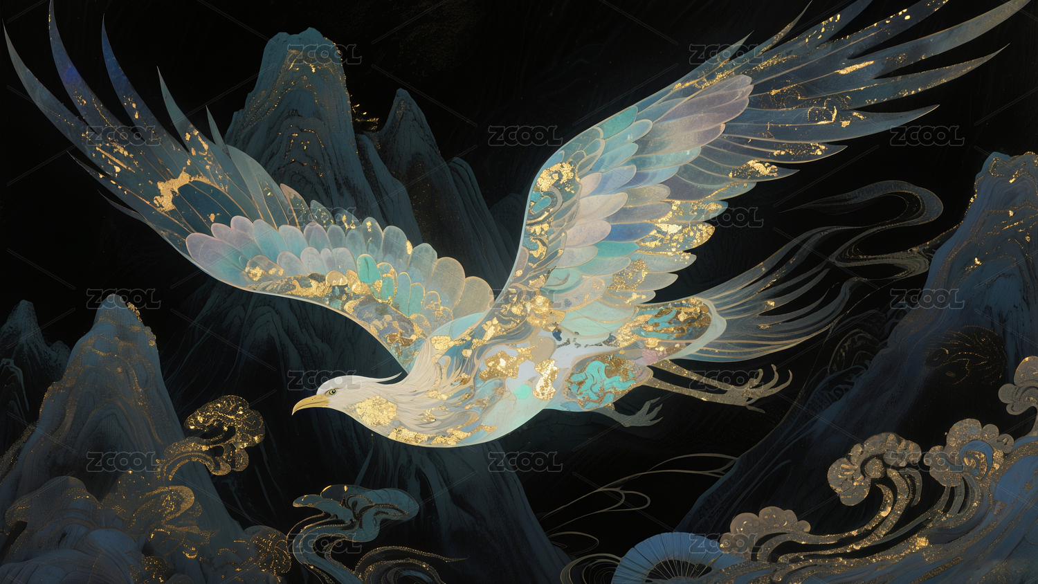 动物,孔雀,国风,古风,复古,岩彩,金色,蓝色,插画,绘画