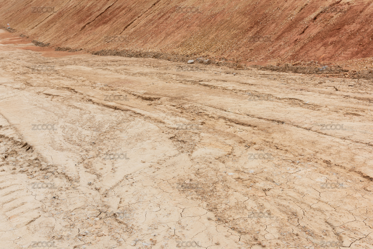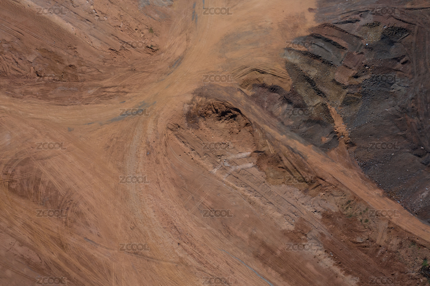 俯拍建筑工地红色沙土地和道路车辙背景