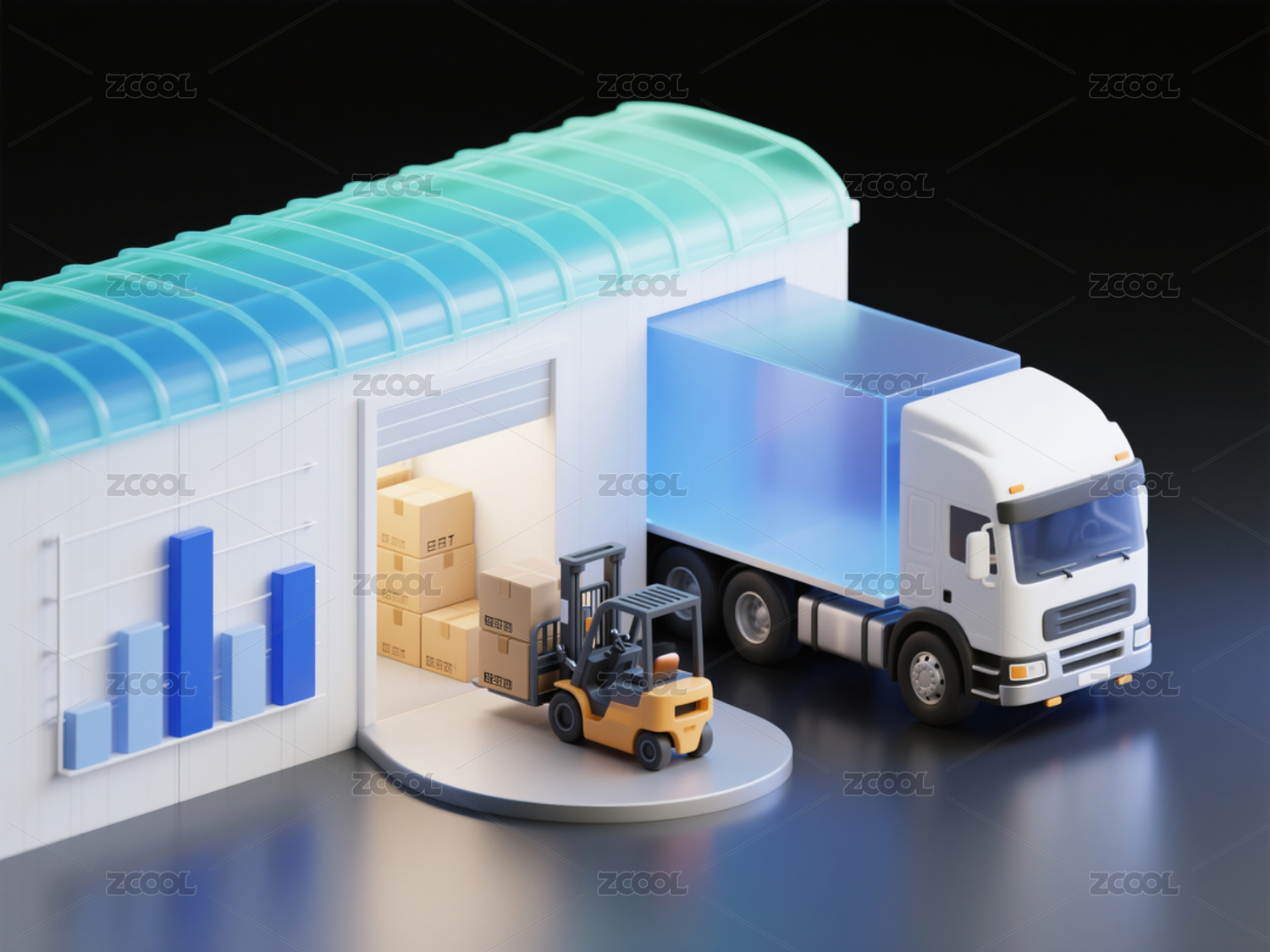 三维卡通插画白色卡车与快递纸箱蓝色背景